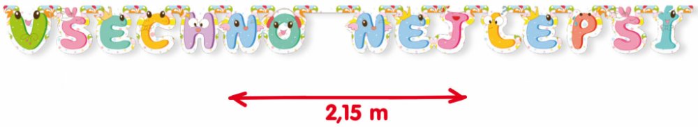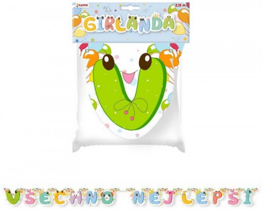 Super tip na oslavu - girlanda Všechno nejlepší! Délka je cca 215 cm a výška je 15 cm. Stačí roztáhnout a pověsit. Girlanda je s tvrdšího papíru. Písmenka jsou spojená nýtem a ukončená provázkem na přivázání. S touto parádní girlandou bude tvoje výzdoba na párty nepřehlednutelná.
