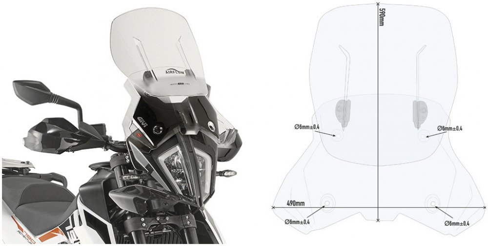 Nastavitelné plexi GIVI Airflow v rozsahu 120 mm. Lze montovat i na KTM Adventure 790 R (19-20) a KTM Adventure 390 (20-21). Lze montovat i na KTM Adventure 890 (21).