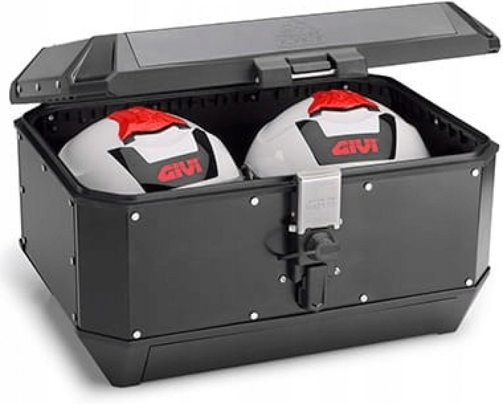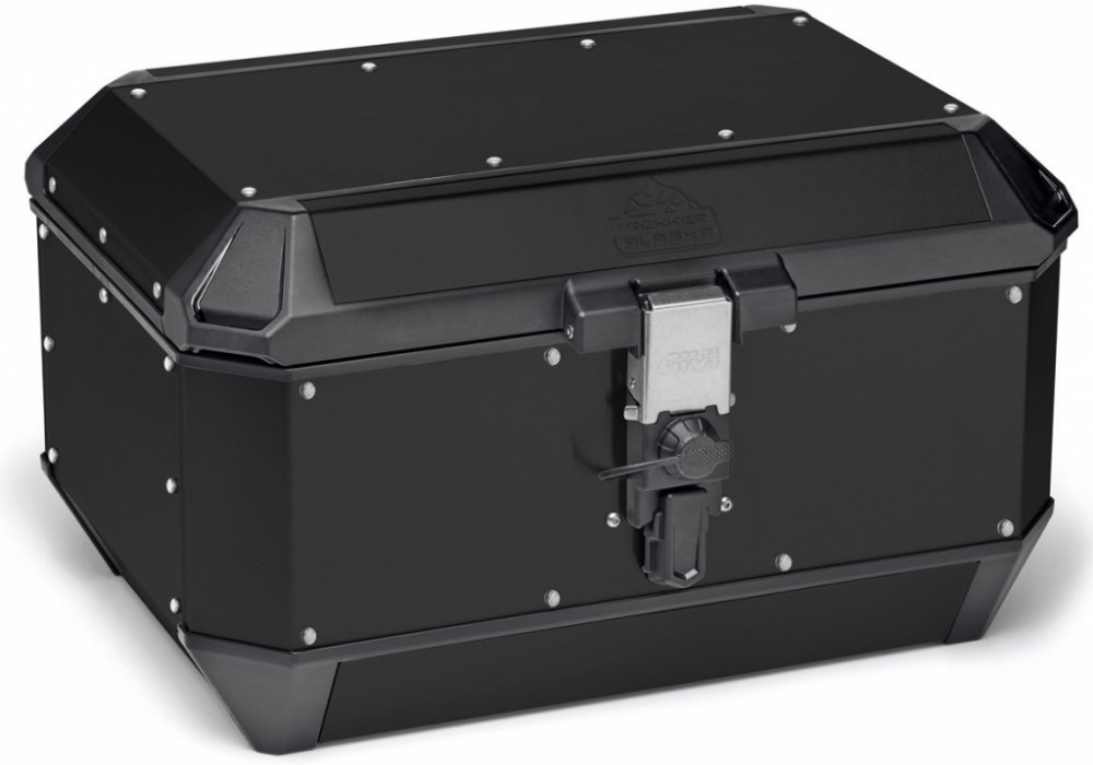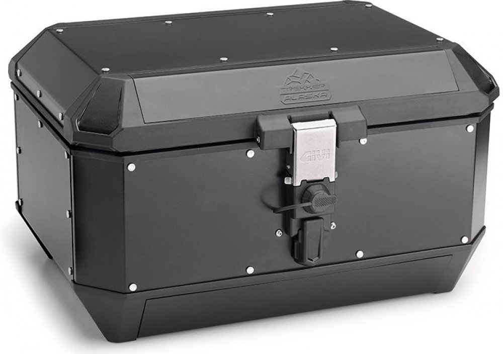 Kufr na motorku Trekker Alaska z přírodního hliníku, lakovaného černou matovou narvou, 56 l., který pohodlně pojme 2 modulární přilby.