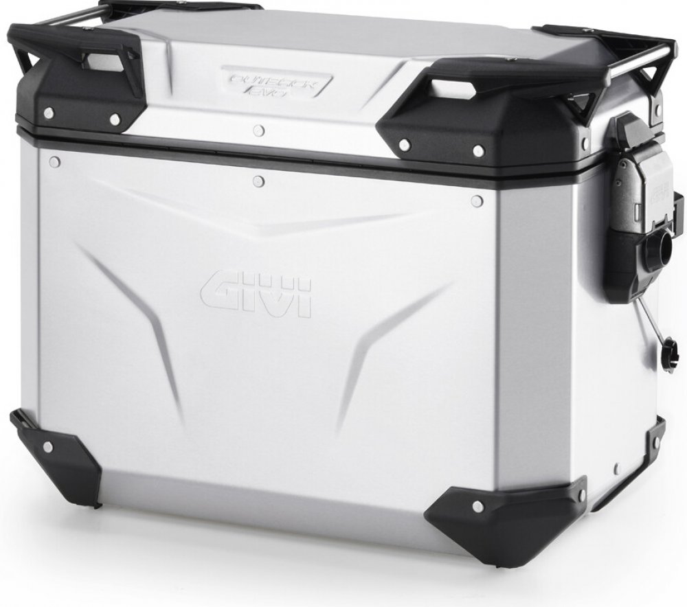 GIVI Trekker Outback EVO SMART = KUFR JE DODÁVÁN BEZ ZÁMKU. Kufr levý boční celohliníkový stříbrný anodizovaný (eloxovaný - povrchová úprava, která chrání proti otěru a oxidaci) s nahoru otevíracím víkem, objem 44 litrů, rozměry šxvxh = 557x393x306 mm (z čelního pohledu), nosnost 10 kg. Lze použít jako boční kufr - nutno použít speciální trubkové nosiče pro kufry Monokey (PL....CAM - trubka 18 mm)...
