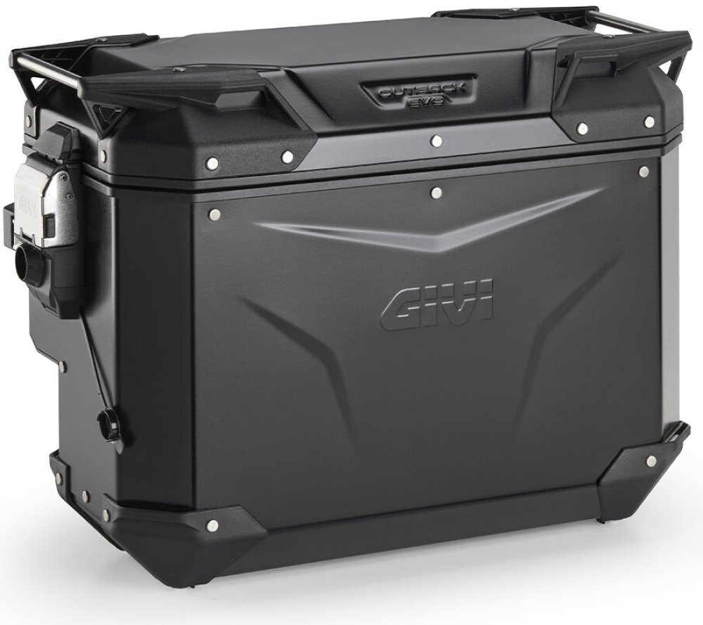 GIVI Trekker Outback EVO SMART = KUFR JE DODÁVÁN BEZ ZÁMKU. Kufr pravý boční celohliníkový černě lakovaný s nahoru otevíracím víkem, s vybráním na výfuk motocyklu, objem 40 litrů, rozměry šxvxh = 557x393x306 mm (z čelního pohledu), nosnost 10 kg. Lze použít jako boční kufr - nutno použít speciální trubkové nosiče pro kufry Monokey (PL....CAM - trubka 18 mm). Pro kombinaci s levým bočním kufrem OBK...