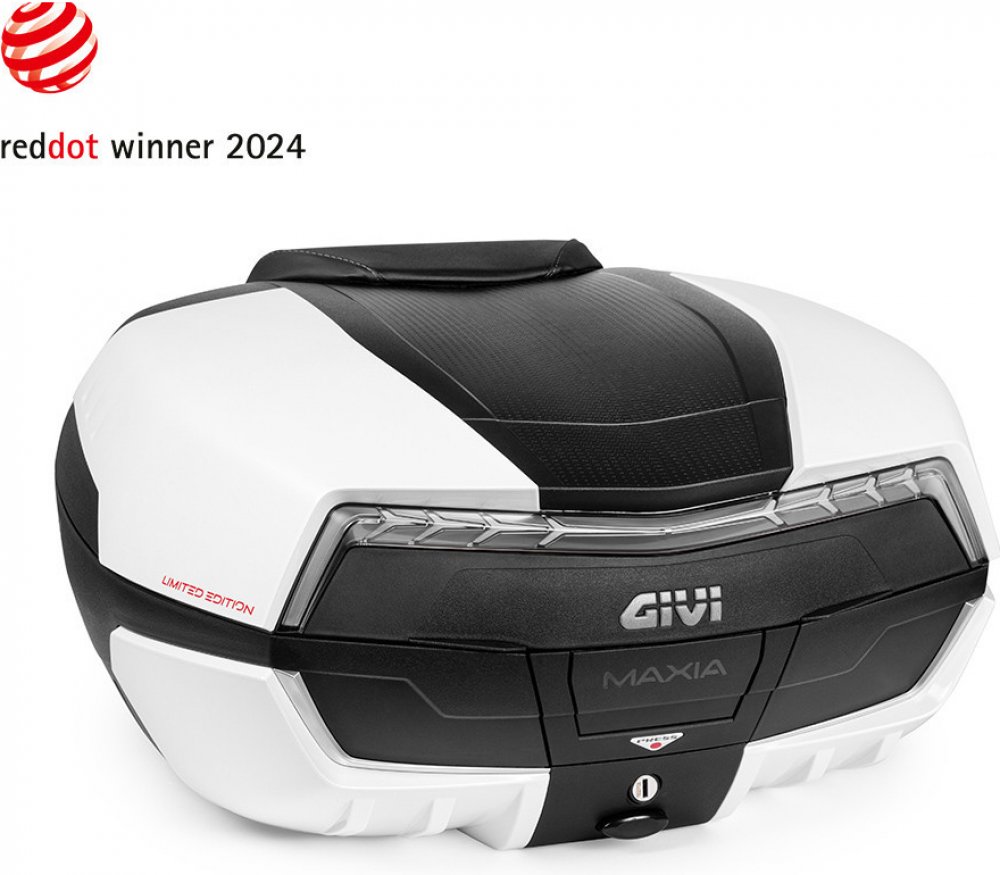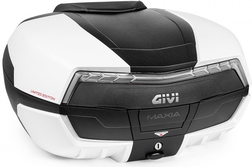 Horní kufr V58 MAXIA5 Limited Edition, černý s průhledným reflektorem a čtyřmi kryty v perleťově bílé barvě. Standardně nabízí opěradlo pro spolujezdce a vnitřní kapsu na dokumenty. • Čtyři kryty v perleťově bílé barvě s tamponovým potiskem LIMITED EDITION po stranách • Průhledný reflektor a dvě chromované dekorace na základně • Opěradlo z pěnové gumy s látkovým čalouněním s logem GIVI • Vnitřní kapsa na dokumenty vyrobená z látky, ukotvená k základně • Rozměry kufru 598 x 321 x 494 mm (š x v x hl) • Maximální doporučené zatížení 10 kg • Kapacita kufru je pro uložení 2 výklopných přileb GIVI u svých kufrů zaručuje stupeň voděodolnosti ekvivalentní silnému dešti. Kufry jsou zejména testovány speciálním strojem, který simuluje déšť s průtokem 20 l/min.