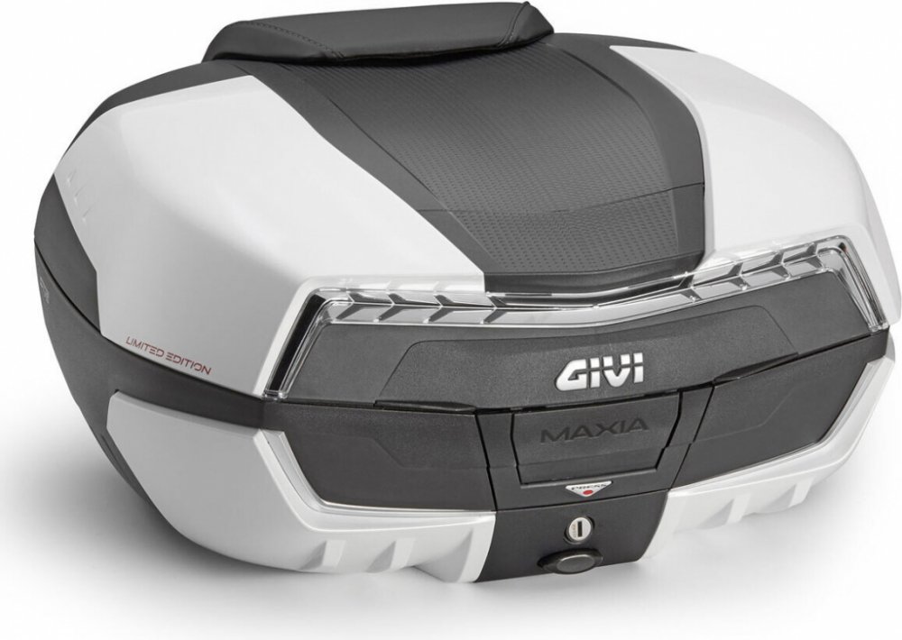 Horní kufr V58 MAXIA5 Limited Edition, černý s průhledným reflektorem a čtyřmi kryty v perleťově bílé barvě. Standardně nabízí opěradlo pro spolujezdce a vnitřní kapsu na dokumenty. • Čtyři kryty v perleťově bílé barvě s tamponovým potiskem LIMITED EDITION po stranách • Průhledný reflektor a dvě chromované dekorace na základně • Opěradlo z pěnové gumy s látkovým čalouněním s logem GIVI • Vnitřní k...