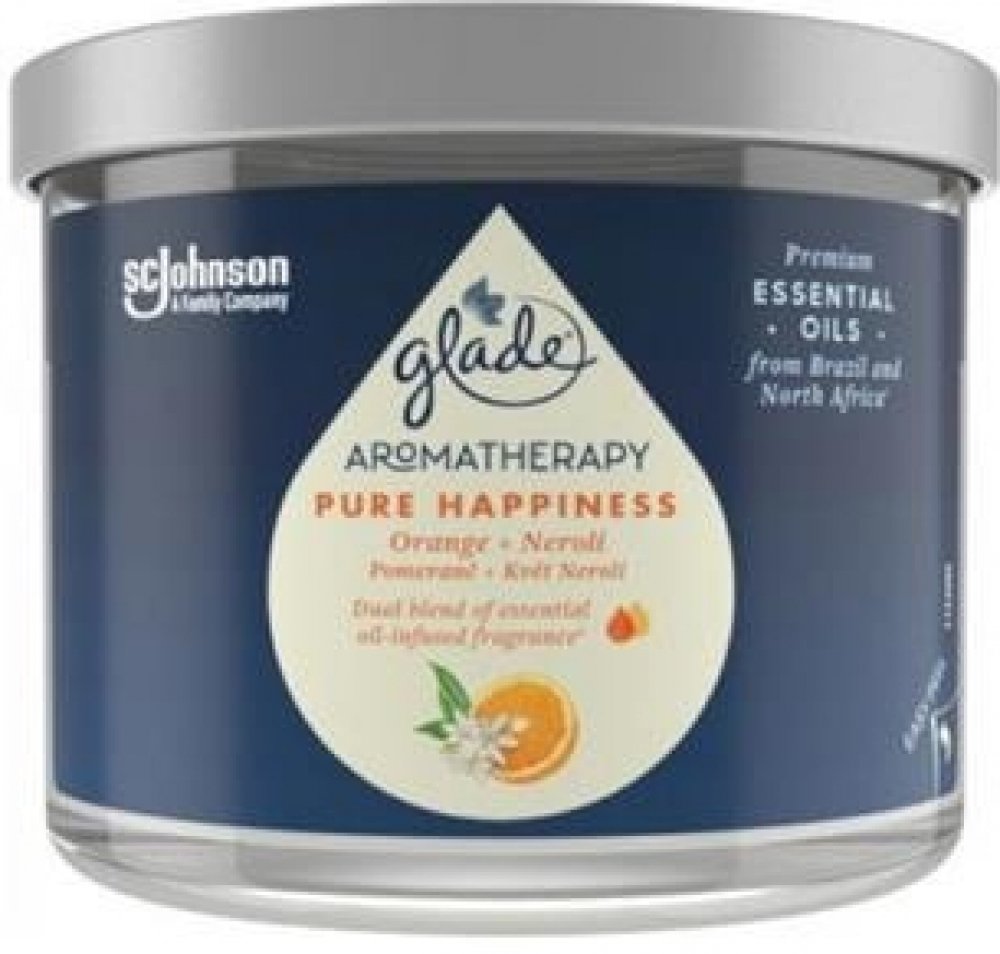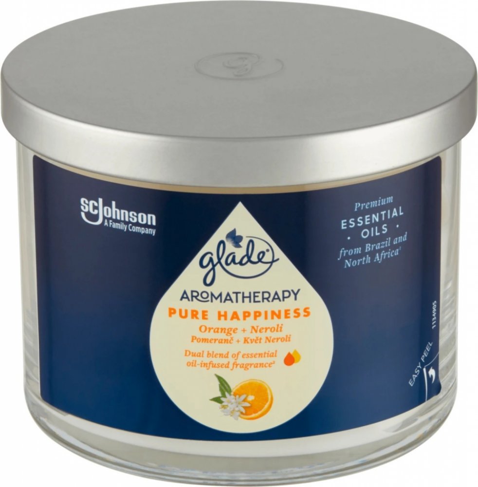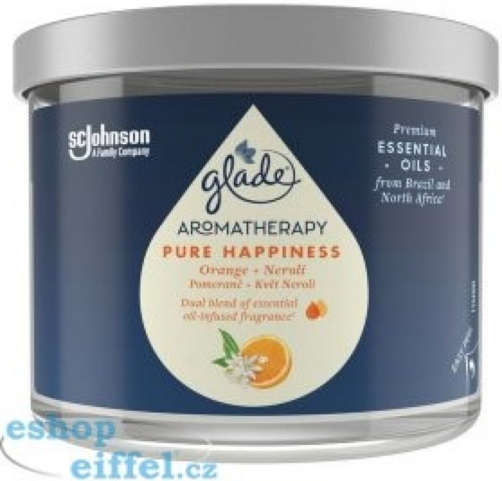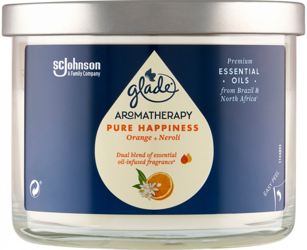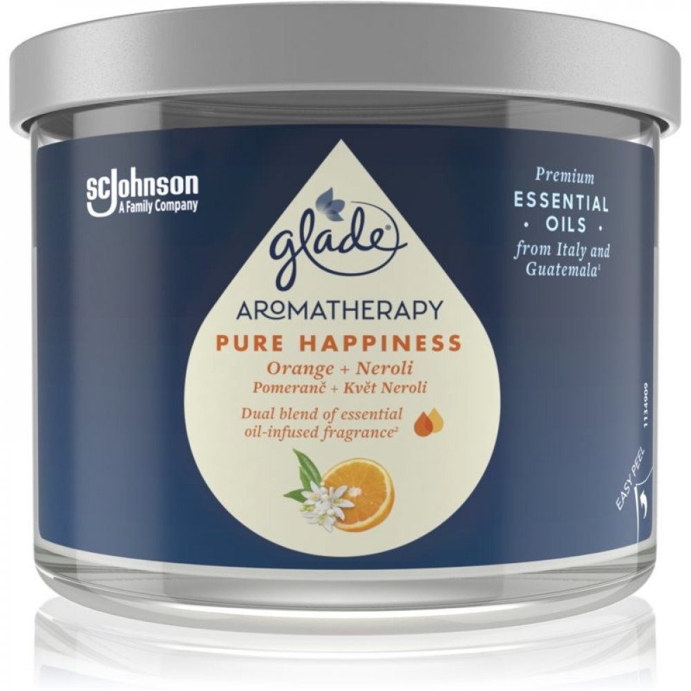 Vonná svíčka GLADE Aromatherapy Pure Happiness vám zajistí až 60 hodin příjemné vůně s jemným teplým světlem. Vosk je vyroben z rostlinných zdrojů, bez použití umělých barviv. Kovové víčko navíc chrání stálost esenciálních olejů a tím kvalitu vůně.