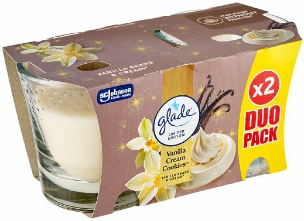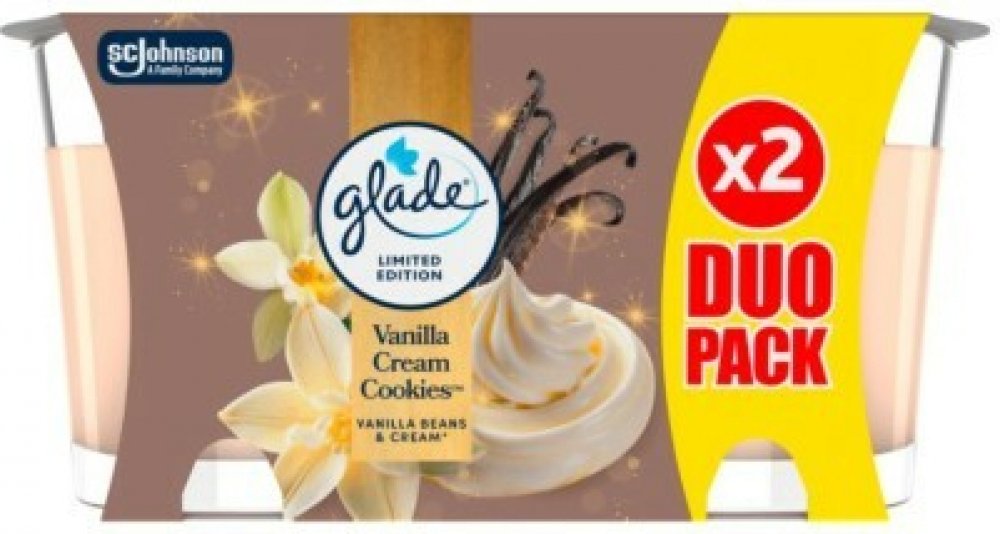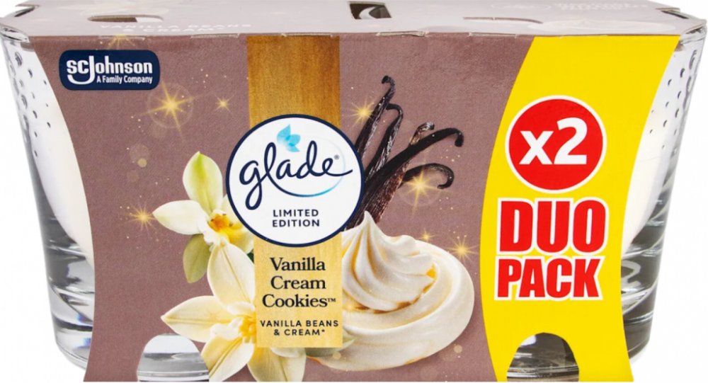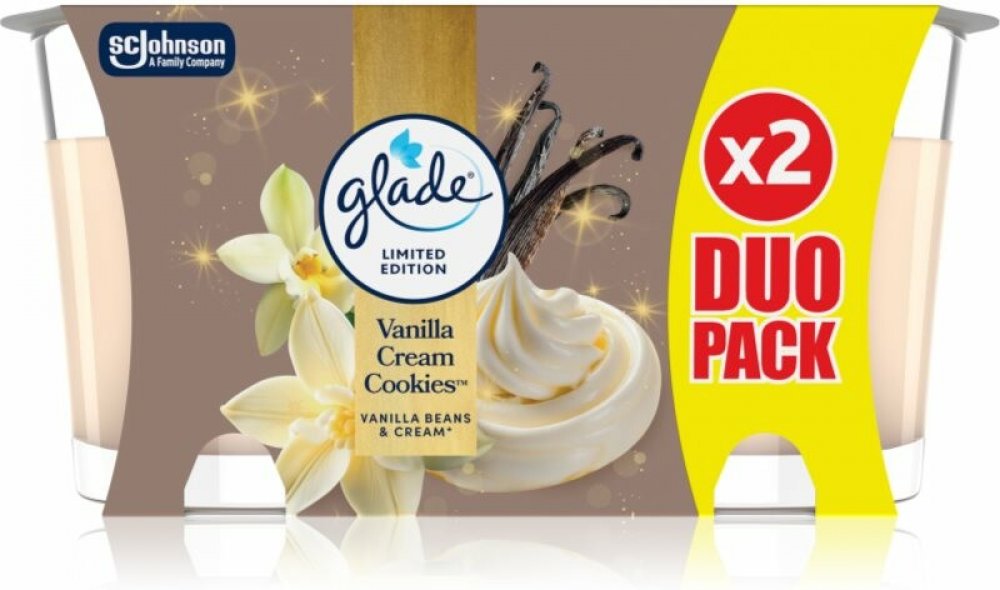Glade Vanilla Cream Cookies je vonná svíčka, která přináší do vašeho domova hřejivou a útulnou atmosféru díky sladké vůni vanilkových sušenek s krémovým nádechem. Balení obsahuje dvě skleněné svíčky o hmotnosti 112 g každá, což je ideální pro dlouhotrvající provonění místnosti. Hlavní vlastnosti: Vůně: kombinace vanilkových lusků a smetanového krému, evokující čerstvě upečené sušenky. Vosk: vyrobený bez palmového oleje, s výjimkou parfému a barviv. Doba hoření: až 30 hodin na jednu svíčku, celkem až 60 hodin pro celé balení. Skleněný obal: elegantní design vhodný do každého interiéru. Esenciální oleje: obsahuje esenciální oleje pro intenzivní a dlouhotrvající vůni. Ideální pro vytvoření útulné a sváteční atmosféry během zimních měsíců. Relaxaci a odpočinek po náročném dni. Doplnění dekorace vašeho interiéru elegantním způsobem. Dárek pro milovníky svíček a přírodních vůní.Bezpečnostní upozornění produktu (H-věty)H412: Škodlivý pro vodní organismy, s dlouhodobými účinky.Pokyny pro bezpečné zacházení (P-věty)P102: Uchovávejte mimo dosah dětí.P501: Odstraňte obsah/obal dle instrukcí na výrobku.