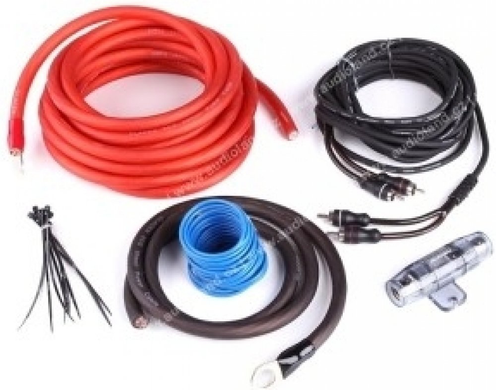 Kompletní sada: Obsahuje 5 m červeného a 1 m černého napájecího kabelu (20 mm²), 5 m modrého remote kabelu, 5 m dvoukanálový ECO cinch kabel, pojistkové pouzdro a kabelovou svorku.