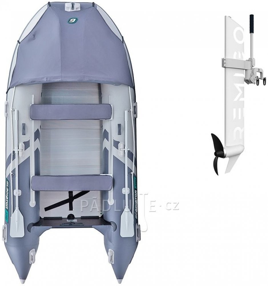 Prostorný nafukovací člun s robustní konstrukcí s hliníkovou podlahou a nafukovacím kýlem. Uveze až 5 osob, takže je ideální pro rodinnou rekreaci, pro rybáře a díky silnější motorizaci až do 30 HP se hodí i na vodní sporty. Gladiator C370 navíc disponuje luxusní výbavou jako je příďový stan s úložný vakem nebo měkkými sedáky na lavičky a dalším příslušenstvím.