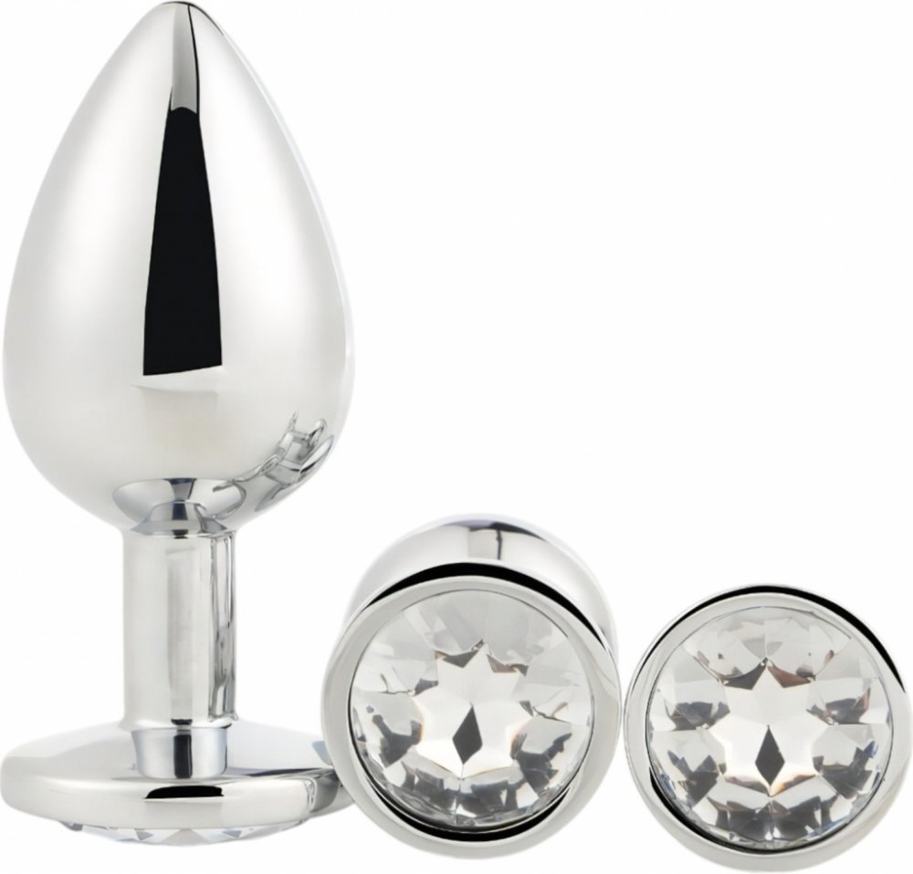 Anální rozšiřování jemně a s radostí! Proč je to super? Očarující kulatá základna zdobená diamantovým kamínkem - opravdový šperk pro tvůj zadeček3 různé velikosti - postupné a pohodlné rozšiřováníÚplně pevný, vyrobený z hliníku - nádherně lesklý vzhledKuželovitý, zužující se tvar - snadné zasunutíRozšířená základna - bezpečné použitíÚzký krček - pohodlné nošení100% voděodolný - žádné elektrické části, snadná údržba, můžeš použít i ve vaně nebo ve spršeBez obsahu silikonu, takže můžeš používat jakýkoliv lubrikantNa to si dej pozor: Před i po každém použití důkladně umyj a dezinfikujNepoužívej najednou do vagíny i do análu (nejdřív vždy očisti)Hliník je na dotek ze začátku studenýJak používat? Po pořádné předehře a uvolnění svalů, s dostatkem lubrikantu začni nejmenším dildem.Stahuj a povoluj svaly, jako bys posiloval/a.Ze začátku cvič jen krátce. Pro větší zážitek ho můžeš lehce vytahovat a zasouvat zpět.Jakmile to půjde snadno a bude ti to pohodlné, můžeš zkusit větší velikost. Krouživými pohyby zvýšíš intenzitu zážitku!Obsah sady: 1x malý anální dildo (vel. S): celková délka (se základnou): 7 cmprůměr: 2,6 cmprůměr krčku: 1 cmprůměr základny: 3,1 cmhmotnost: 45 g1x střední anální dildo (vel. M): celková délka (se základnou): 8,1 cmprůměr: 3,3 cmprůměr krčku: 1 cmprůměr základny: 3,4 cmhmotnost: 90 g1x velký anální dildo (vel. L): celková délka (se základnou): 9,5 cmprůměr: 4 cmprůměr krčku: 1,2 cmprůměr základny: 4,1 cmhmotnost: 160 gSpecifikace produktu: sada 3 kusůkompletně z pevného kovuanatomický, kuželovitý tvarzdobené kamínky s diamantovým efektemkulatá základnalesklý a zářivý vzhledbezpečná, rozšířená základnavoděodolné, snadno se čistíbarva: stříbrná s průhledným kamínkemmateriál: hliník (v souladu s EU normami, bez ftalátů)Doporučení pro čištění: Důkladně umyj jemným mýdlem a vlažnou vodou, poté opláchni a nech oschnout. Doporučujeme: použití speciálního čisticího prostředku (8718627520062) - lze objednat zvlášť.