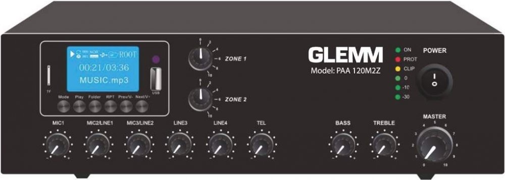 2-zónová rozhlasová ústredňa pre 100V s možnosťou nízkoimpedančného zapojenia 4-16Ω. Obsahuje vstupy: 1x MIC (XLR), 2x MIC/Line (jack6,3mm), 2x Line (2x RCA), 1x pre FM anténu, 1x TEL. Výstupy: 1x LINE (2x RCA), 4-16ohm/70V/100V, 2x 100V. Má vstavaný MP3 prehrávač s displejom, USB konektorom, slotom pre microSD kartu, Bluetooth pripojením, FM tunerom a dialkovým ovládaním. Na mikrofónnom vstupe 1 ...