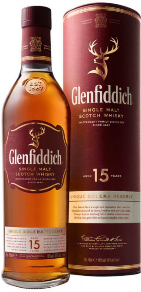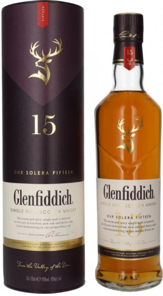 Glenfiddich 15 let je jedny z nejprodávanějších čistých sladových whiskey. Má jasně zářivou zlatavou barvu. Její aroma připomíná čokoládu s náznakem rašeliny a opečeného toastu.