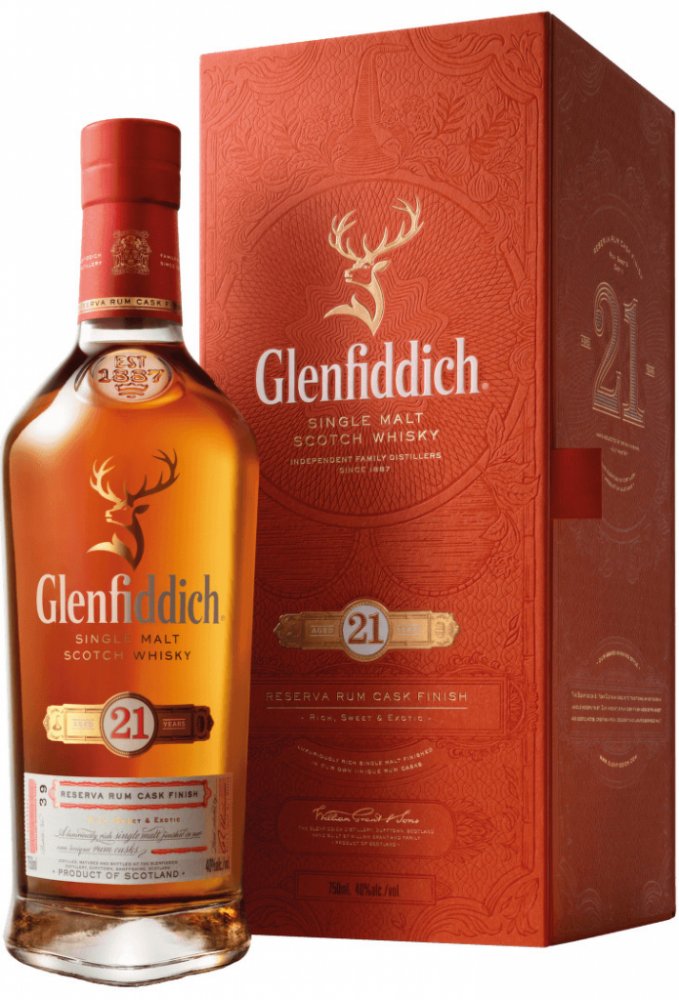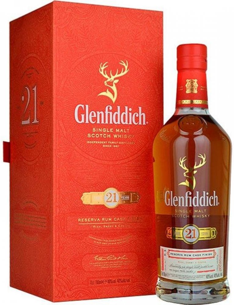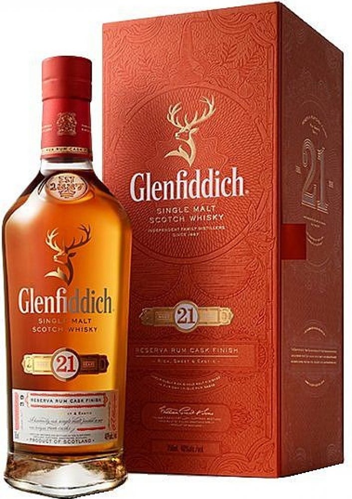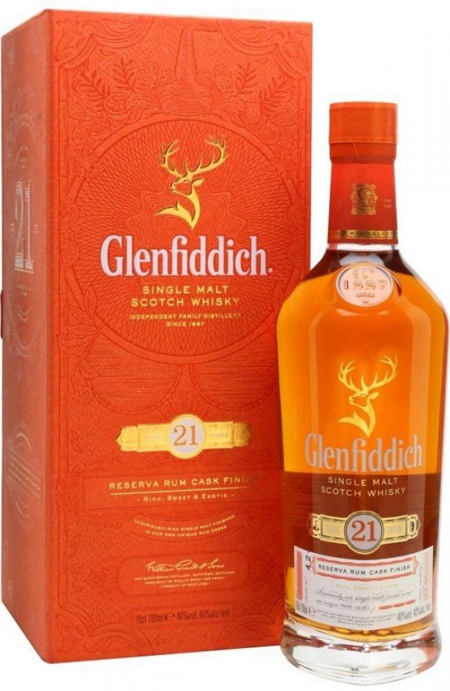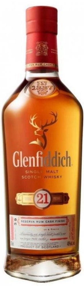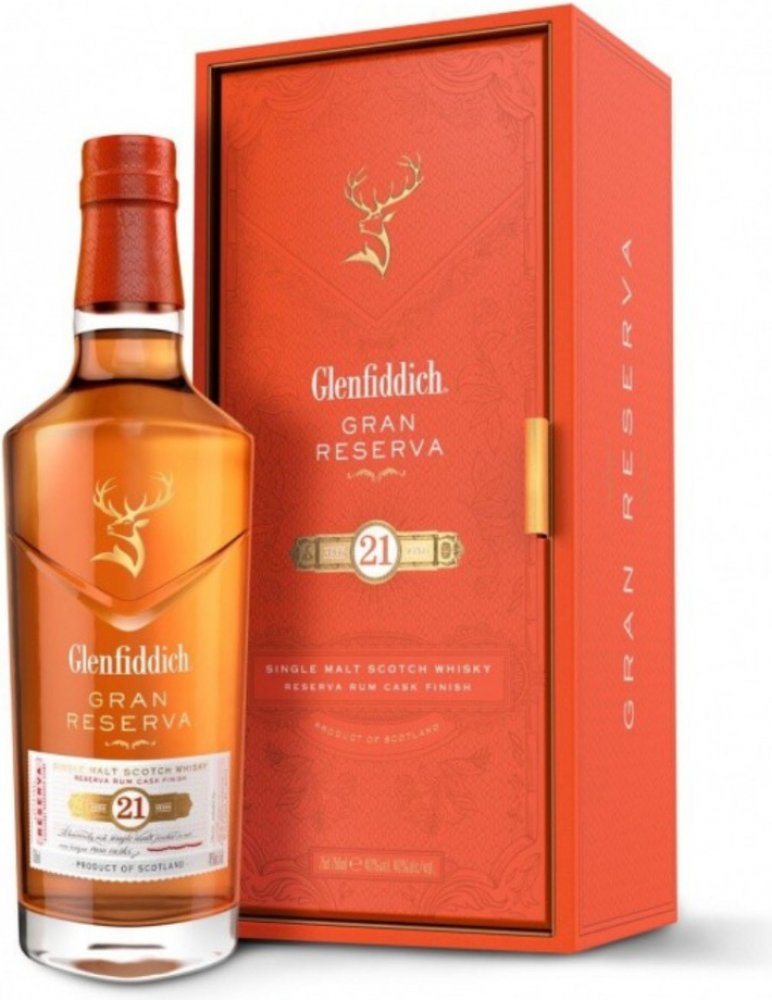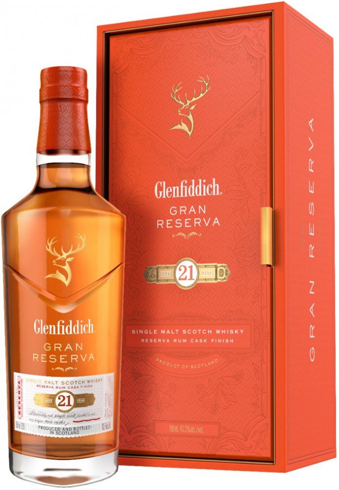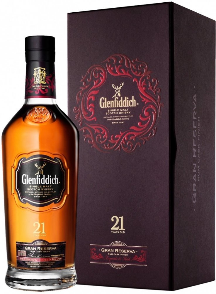 Pro dozrávání whisky Glenfiddich 21 y.o. Gran Reserva byly použity sudy po prémiovém karibském rumu. Zdánlivý detail, který nádherně dokresluje celkový dojem této jedinečné whisky. Destilát nejdříve zraje 21 let v sudech z amerického dubu po bourbonu a poté je přečerpán do speciálně vybraných sudů po karibském rumu, kde zraje další 4 měsíce. Právě zrání v pečlivě vybraných sudech po karibském rumu zintenzivňuje plný charakter této whisky. Každá láhev, která je uložena v luxusním dárkovém boxu je podepsána hlavním míchačem palírny Glenfiddich Brianem Kinsmanem. Tmavě zlatá barva s intenzivním aroma s tóny květin, sladké vanilky s lehkým nádechem fíků, banánů, mléčné karamelky, nové kůže v pozadí s příjemným dubem a pomerančové kůry. Chuť je zpočátku velmi jemná, poté se ale rozvine do příjemné svižnosti a živosti. Postupně se začínají objevovat sušší tóny s náznakem příjemné pepřovitosti, suché dubovosti, až téměř zázvorové suchosti a ostrosti. Příjemný náznak lehkého dřevitého kouře toustovaného dřeva, koření jemných citrusů. Velmi dlouhý, hřejivý, suchý a kořenitý závěr. Glenfiddich je považován za nejznámější whisky palírnu na světě. Založil ji v roce 1887 William Grant. Destilerka se nachází v blízkosti města Dufftown v oblasti Speyside. Je pojmenována podle údolí Glen Fiddich, ve kterém leží, což v galštině znamená údolí jelenů, a odtud i busta jelení hlavy v logu značky.