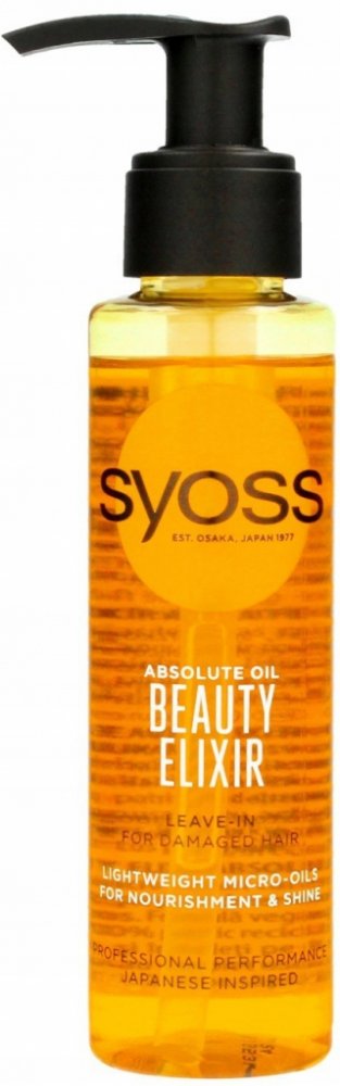 SCHWARZKOPF&HENKEL - SYOSS - Beauty Elixir Absolute Oil - regeneruje a dodává hebkost vlasům 100ml * Syoss Absolute Oil - denní péče s recepturou ultra lehkých mikro olejů * Intenzivně regeneruje suché poškozené vlasy a okamžitě dodává pocit hebkosti * Syoss je řada vlasové péče speciální vyvinutá s kadeřníky a kadeřníky používaná.Její vysoce účinná receptura s prvotřídními složkami poskytuje perfektní výsledek při každodenním domácím použití * Profesionální kvalita-profesionální výsledky * Hezky voní, nezatěžuje a nemastí vlasy a díky pumpičce je praktický * Je vhodný k použití jak po umytí do mokrých vlasů, tak před žehlením do konečků a vlasy jsou pak hebké, voňavé a lesklé *