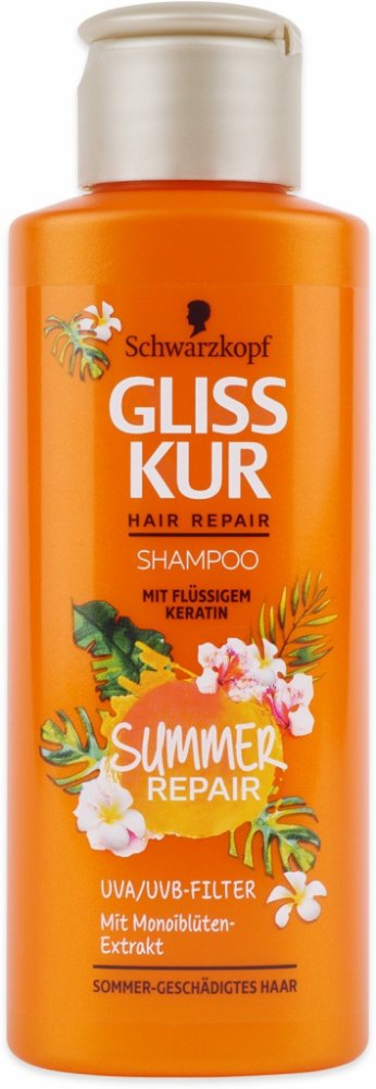 Schwarzkopf Gliss Kur Summer Repair pečující šampon pro létem namáhané vlasy s meruňkovým olejem, který obsahuje UVA/UVB filtr. Regeneruje sluncem poškozené vlasy, obnovuje jejich lesk, chrání je před vysušováním a před vyblednutím barvy. Okamžitě vyživuje vlasy namáhané sluncem, mořskou a chlorovanou vodou.
