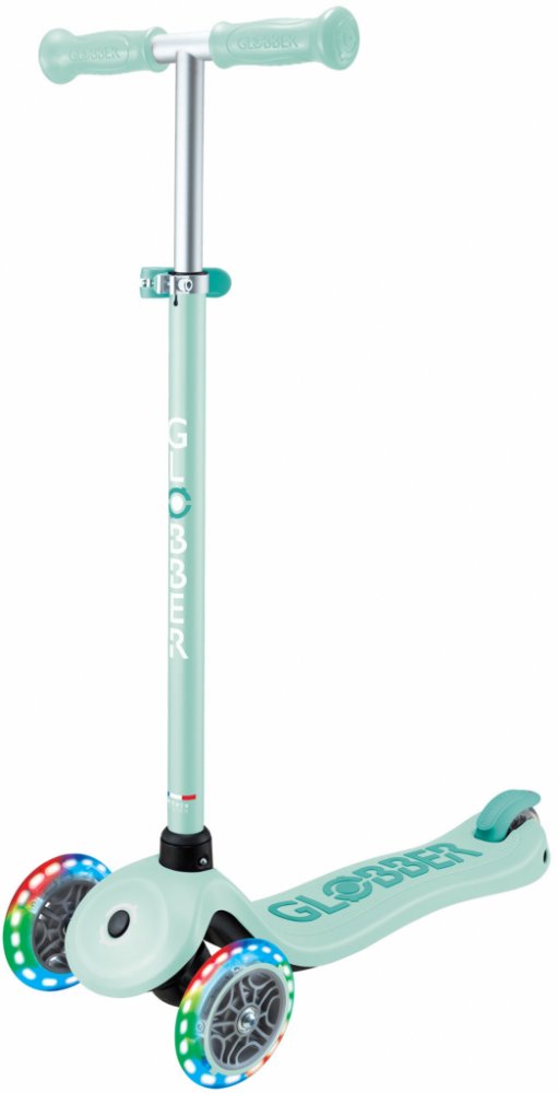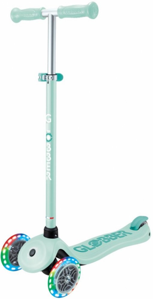 3-kolová koloběžka se světly vybavená 4-výškově nastavitelnou T tyčí, patentovaným systémem zámku řízení, LED podsvícenými koly a nízkým bi-vstřikovým designem, PRIMO PLUS LIGHTS je nabitý všemi funkcemi, které vaše dítě potřebuje. Nastavitelná T-tyč Globber's PRIMO PLUS LIGHTS 3kolová koloběžka se světly má extra výšku T-tyče oproti původní 3vysoké T-tyči, která se nachází na koloběžkách PRIMO. Nastavitelná hliníková T-tyč ve 4 výškách (67,5 cm, 72,5 cm, 77,5 cm nebo 82,5 cm) poskytuje dětem ještě déle trvajícího společníka na koloběžce – protože roste spolu s nimi! Patentovaný systém zámku řízení PRIMO PLUS LIGHTS má patentovaný systém zámku řízení exkluzivní pro Globber: Přední kola svítící koloběžky lze upevnit vpřed a vzad, což umožňuje vašemu dítěti procvičit rovnováhu a získat jistotu. Když budou připraveny, jednoduše uvolněte tlačítko zámku řízení, aby mohli začít otáčet volantem a spalovat dráhu! Bezbateriová LED kola Užijte si zábavu s PRIMO PLUS LIGHTS a udělejte z vašich dnů na skútru ještě zábavnější! Tato 3-kolová koloběžka se světly pro děti (ve věku 3-9 let) má přední kola s LED podsvícením, která blikají modře, zeleně a červeně, abyste mohli barevně jezdit po celý den. Nejsou potřeba žádné baterie, protože svítící kola využívají osvětlení dynama – běží výlučně na kinetickou energii produkovanou vaší námahou. Užijte si opravdu skvělou zábavu při osvětlení! Protiskluzová deska pro koloběžku Užijte si bezpečnou jízdu na 3-kolové koloběžce PRIMO PLUS LIGHTS se světly, která je vybavena odolnou protiskluzovou plošinou se super nízkou vyztuženou konstrukcí pro pohodlí a bezpečnost. Vypadejte skvěle i při jízdě na skútru, neboť PRIMO PLUS LIGHTS má dvouinjekční desku, která předvádí dvoubarevný design pro živější styly! Vlastnosti produktu 3-kolová nastavitelná svítící koloběžka pro děti ve věku 3-9 let se 4-výškou hliníkovou lakovanou T-tyčí (67,5 cm, 72,5 cm, 77,5 cm, 82,5 cm od země) se snadno použitelnou svorkou a pohodlné TPR ergonomické rukojeti pro pohodlnou jízdu. Patentované tlačítko uzamčení řízení, které fixuje systém řízení dvou předních kol tak, aby se pohybovaly pouze dopředu a dozadu, což pomáhá dětem naučit se udržovat rovnováhu. Odemkněte tlačítko, abyste umožnili jízdu se sklonem k řízení. Odolná a bezpečná 3-kolová koloběžka se světly se super nízkou vyztuženou konstrukcí s protiskluzovou deskou, která podporuje děti do 50 kg. Jeho extra dlouhá kompozitní brzda zajišťuje účinnost a dlouhou životnost kola. Vysoce kvalitní 121 mm přední kola z PU litého LED s vysokým odskokem a bez baterií, které blikají červenou, zelenou a modrou barvou, pro lehké jízdy, které vydrží tak dlouho, dokud dokážete jezdit – čím rychleji jedete, tím jasněji září!