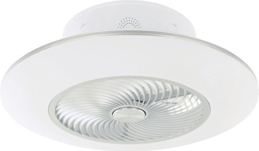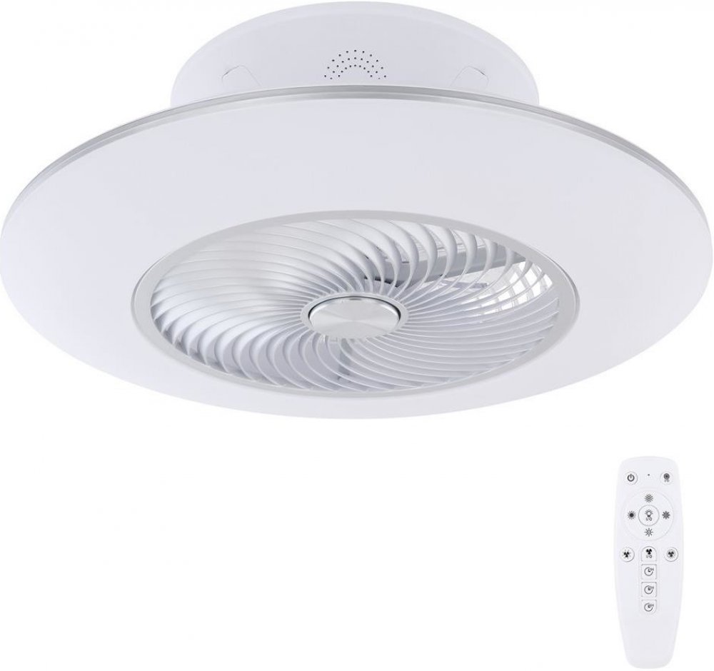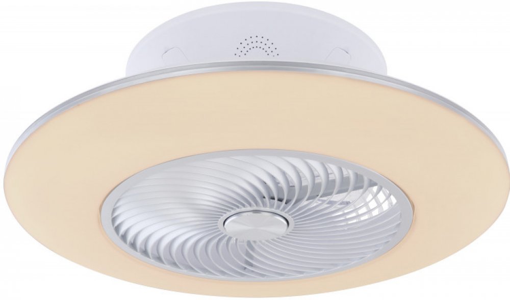 - Tělo ventilátoru je vyrobeno z kovu ve stříbrné barvě, bílého plastu a opálového plastového stínidla.