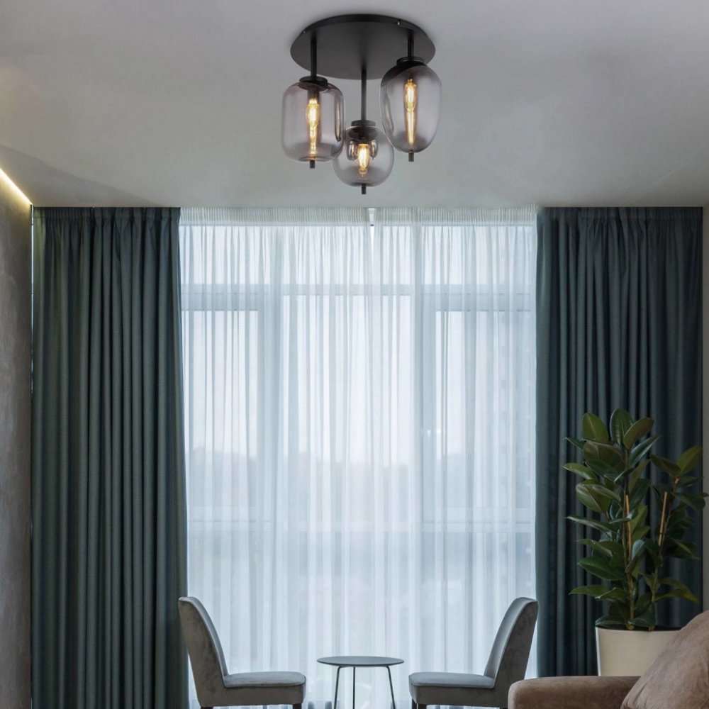 Stropní svítidlo Blacky s různými skleněnými stínidly - 3 světla Toto skvělé stropní svítidlo ze série Blacky zaujme svým krásným designem. Z kulatého černého kovového vrchlíku vystupují do místnosti tři kouřově zbarvená průhledná skleněná stínidla různých tvarů a velikostí. Světelné zdroje zůstávají viditelné, proto doporučujeme použít retrofitní žárovky v paticích E14 - externě stmívatelné