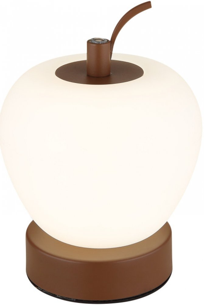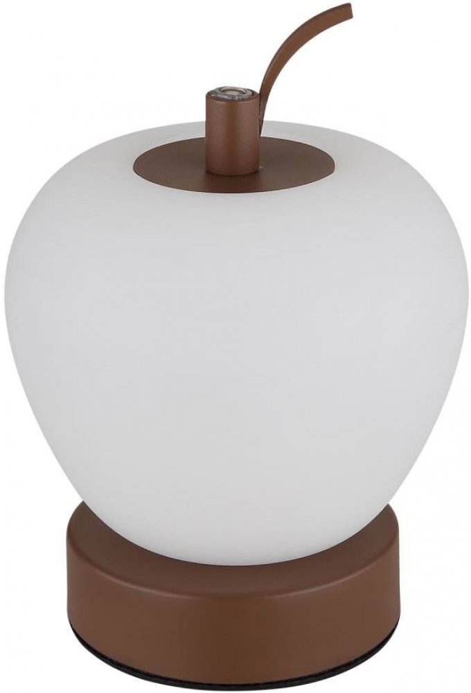 Stolní lampička, hnědý matný kov, plast bílý, černý PVC kabel, dotykové zapnutí/vypnutí, stmívatelné, plynulé dotykové stmívání, aku CR18650 1200mAh 3,7V, doba nabíjení cca 3 hod., průměr 120 mm, výška 165 mm, LED 2W 230V 90lm 2700/6500/4000K.