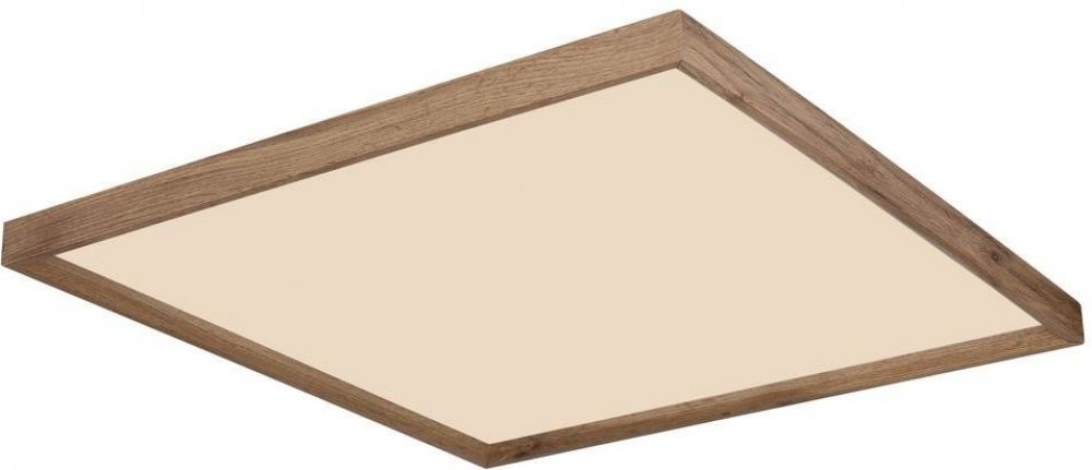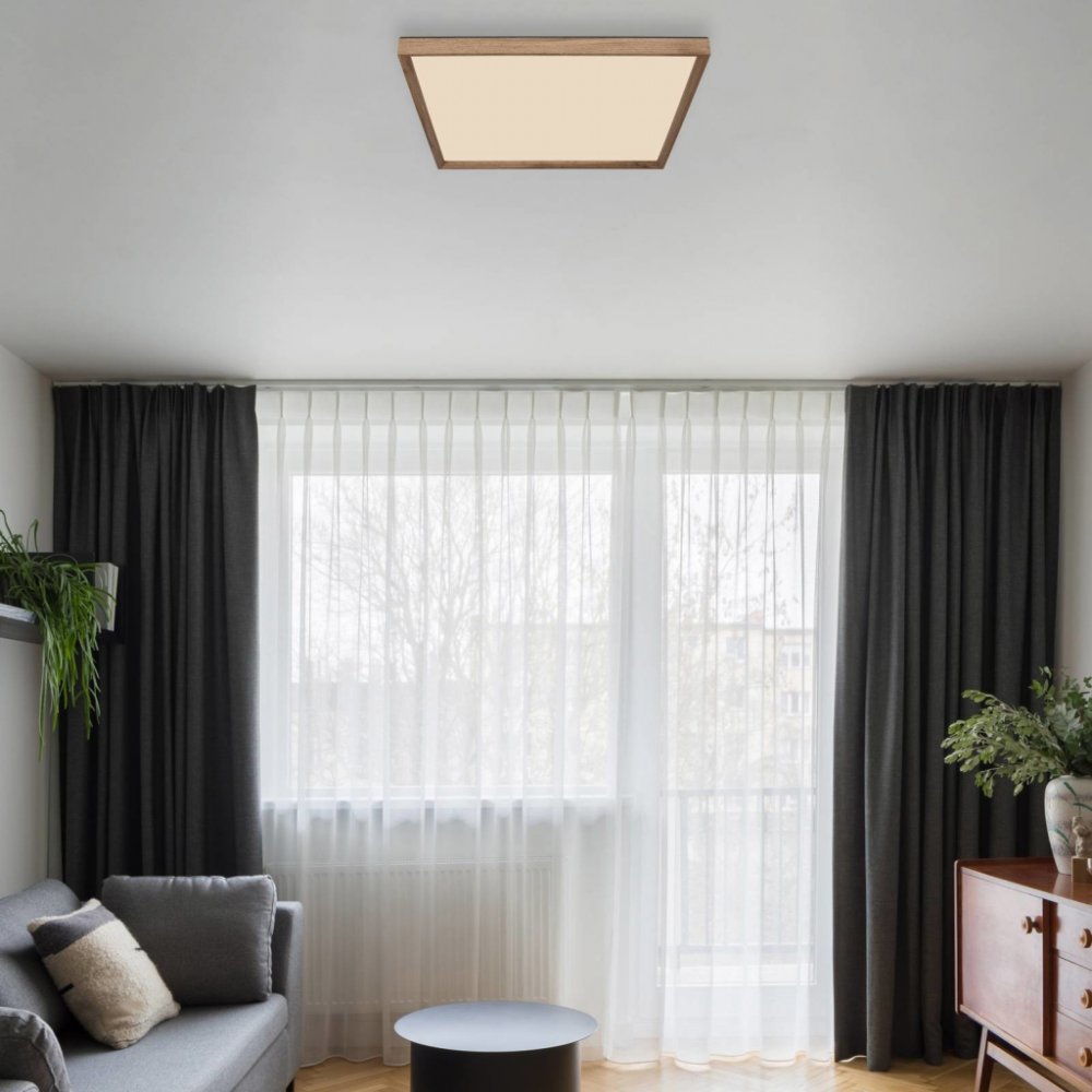 Čtvercové stropní svítidlo LED Cinderella s rámem z MDF s povrchovou úpravou z tmavého dřeva lze přepínat na tři barvy světla (teplá bílá 2 700 K, univerzální bílá 4 500 K nebo denní světlo 6 500 K) pomocí přepínače na svítidle.