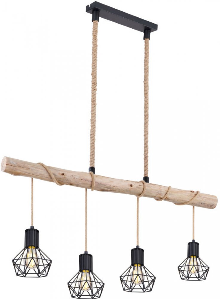 Závěsné svítidlo, kov černý, dřevo, konopné lano, DxŠxV: 1000x150x1200, bez žárovek 4xE27, max. 60W 230V
