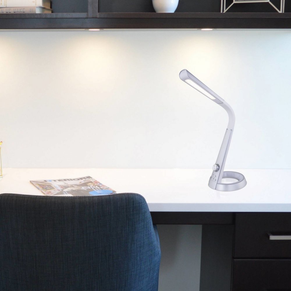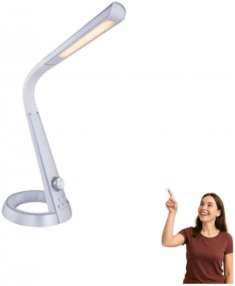 Stolní lampička MITTI z plastu stříbrné barvy je vzorem pro malé i velké. Kvalitní zpracování, vybavená flexo ramenem, měničem barev, dotykovou funkcí a možností fixace barev - tento poutač nenechává nic být žádoucí. Díky přiložené 8W LED žárovce poskytuje tato stmívatelná stolní lampička maximálně 450 lumenů světla s intenzitou světla teplé bílé 3000 Kelvinů, neutrální bílé 4300 Kelvinů nebo studené 6300 Kelvinů. Barvu světla lze různě upravit nebo zafixovat. Zvláštností této stolní lampy je poutavá základna, která může svítit různými barvami díky integrovanému 2W LED RGB světelnému zdroji. Tuto stolní lampu lze tedy skvěle využít i jako noční světlo.
