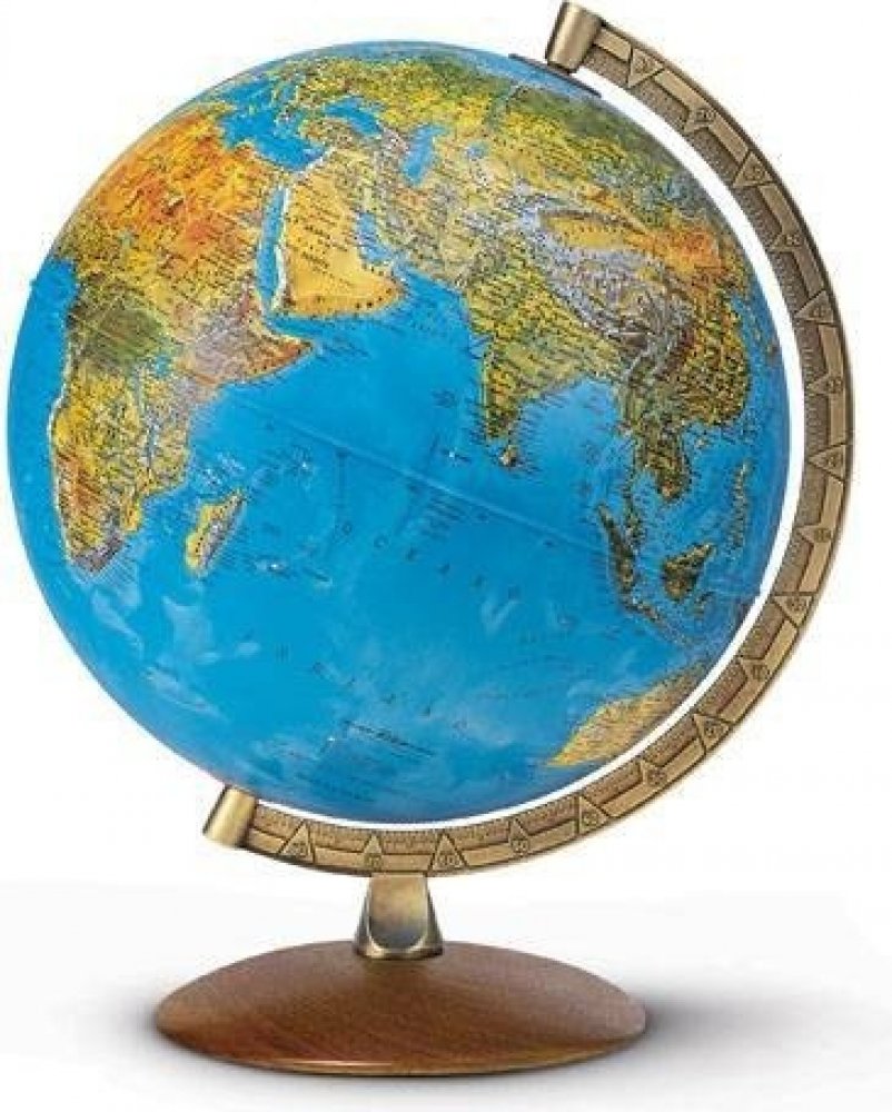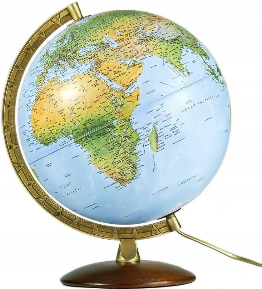 Robustní globus o průměru 30 cm může posloužit jako školní pomůcka, ale hodí se i do kanceláře. Popis v českém jazyce, po rozsvícení se zvýrazní barevné politické rozlišení států. Podstavec je dřevěný, rameno kovové. Žárovka se mění vrchem po vysunutí ramena - návod je přiložen, náhradní žárovka není součástí balení. Baleno v ochranné, odnosné krabici.