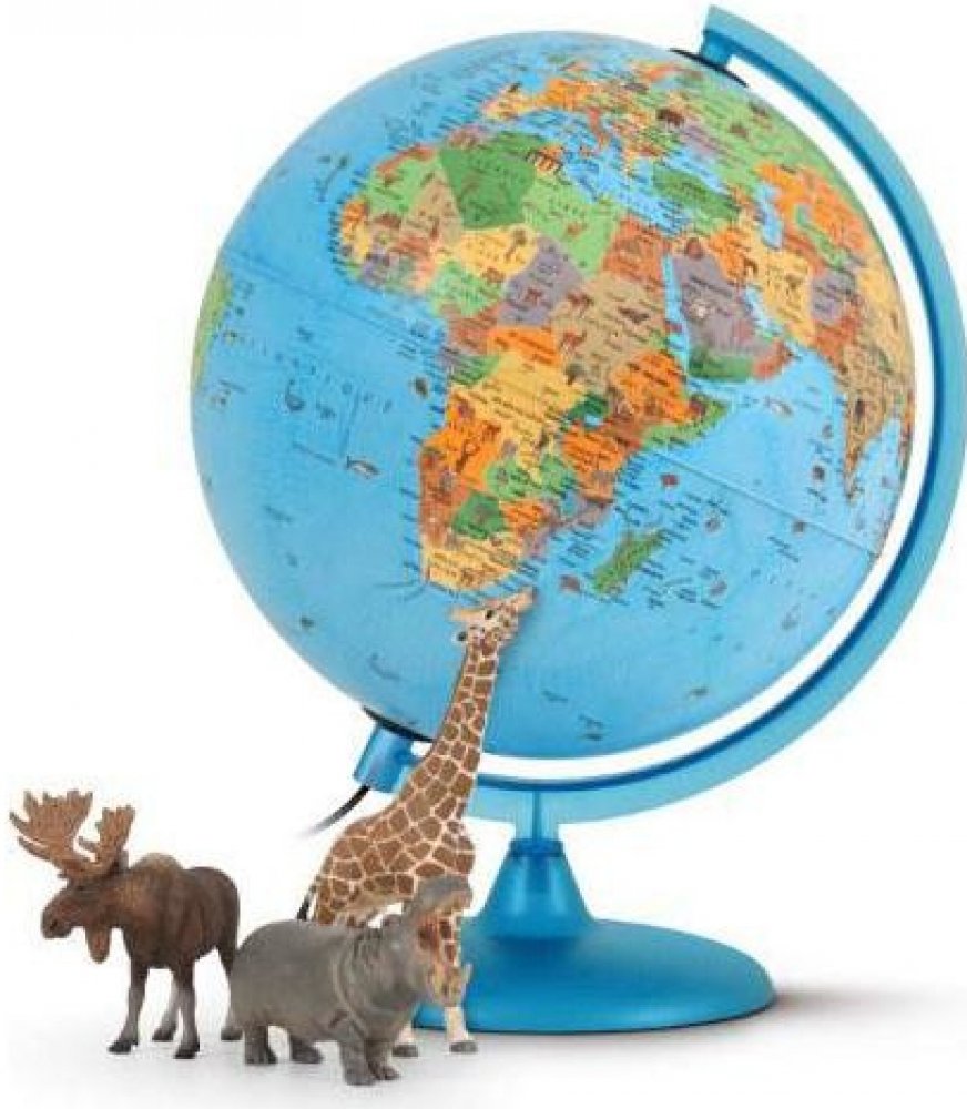Světelný glóbus - politický, doplněn ilustrovanými obrázky zvířat, rostlin a symbolů zemí - významných budov.