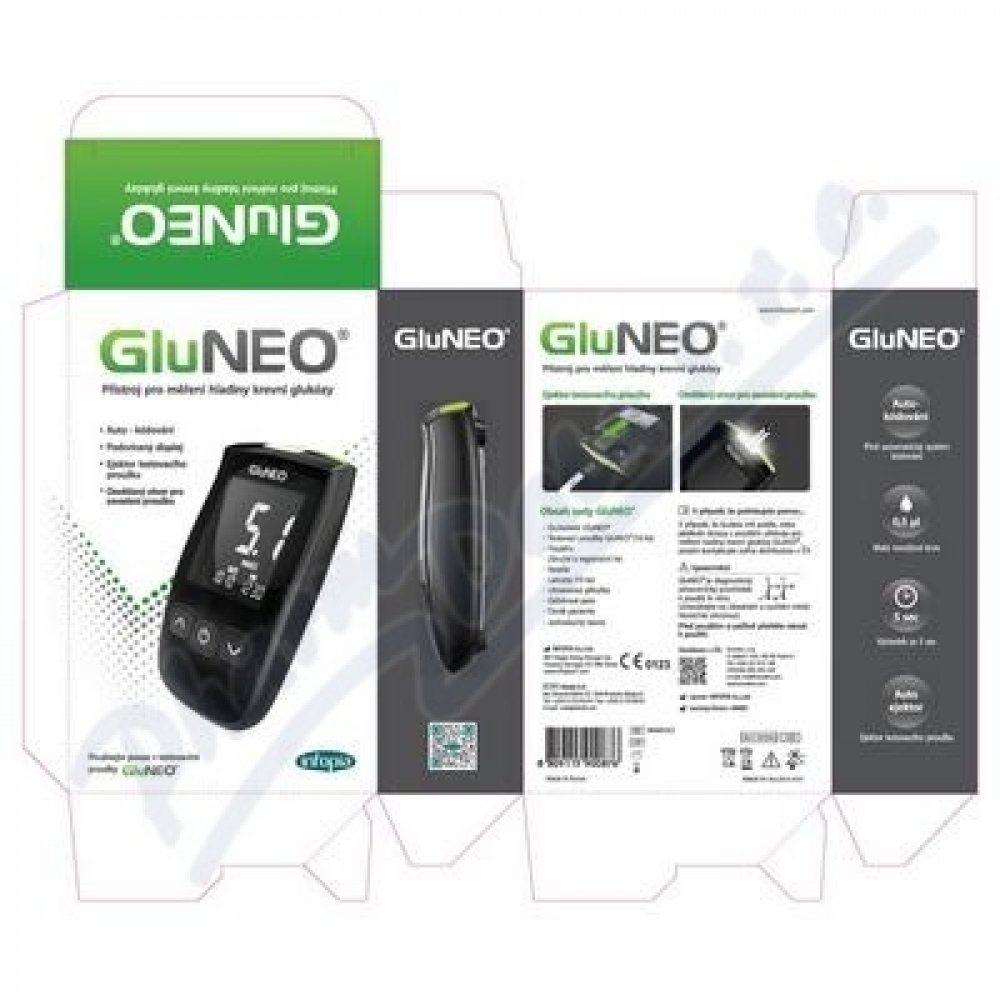 Výrobce ukončil výrobu tohoto glukometru a jeho nástupcem se stal Glukometr GluNEO H. Testovací proužky GluNEO zůstavají v prodeji pouz...