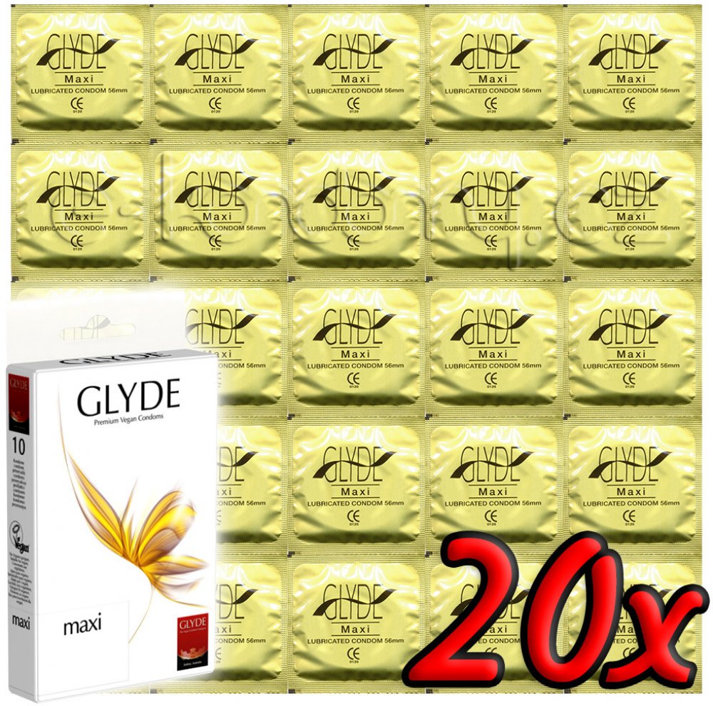 Prémiové veganské kondomy GLYDE Maxi. Balení obsahuje 20 ks kondomů vyrobených z čistého přírodního latexu, díky dvojitému máčení při výrobě jsou tenké, ale zároveň velmi odolné. Bez použití přípravků škodících zdraví a chemikálií, bez aroma, jemně lubrikované 100% silikonovým olejem, bez parabenů a glycerinu.