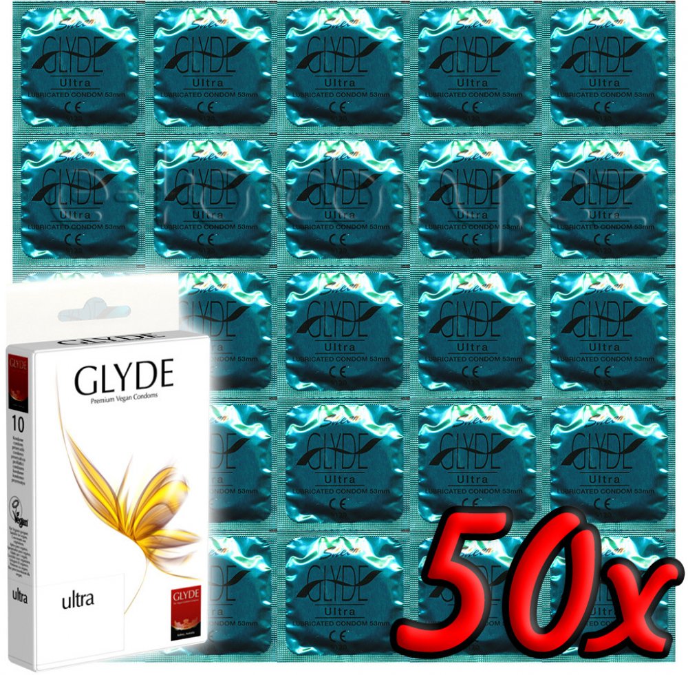 Prémiové veganské kondomy GLYDE z čistě přírodního latexu. Balení obsahuje 50 ks kondomů, které jsou díky dvojitému máčení při výrobě úžasně tenké, ale zároveň velmi odolné. Bez použití přípravků škodících zdraví a chemikálií, jemně lubrikované 100% silikonovým olejem, bez vůně, bez parabenů a glycerinu.