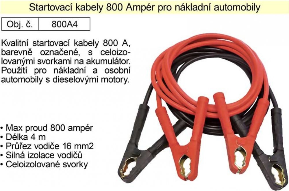 Kvalitní startovací kabely 800 A, barevně označené, s celoizolovanými svorkami na akumulátor. Max. proud 800 Ampér, délka 6 metry. Použití pro nákladní a osobní automobily s dieselovými motory.