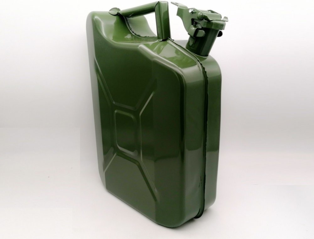Plechový kanystr o objemu 10 litrů je určen k přenášení benzínu, nafty nebo oleje