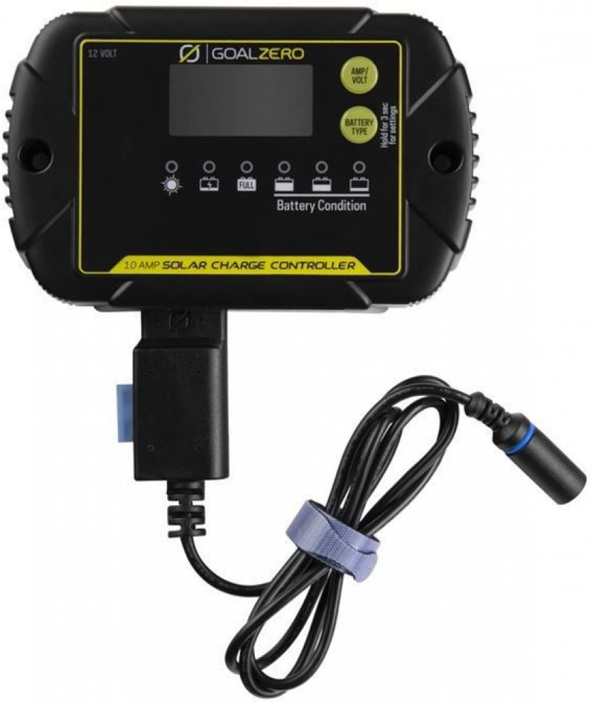 10A Charge controller slouží k monitorování a regulaci solárního výstupu pro 12V baterie. Tento regulátor napětí je dodáván spolu s kabelem pro připojení k APP portu panelů Goal Zero. Regulátor splňuje certifikaci stupně krytí IP65 a je možné jej používat i v prašném a vlhkém prostředí.