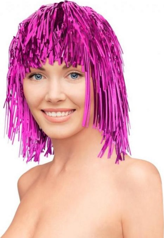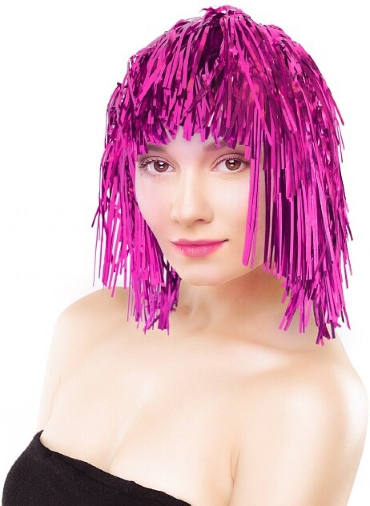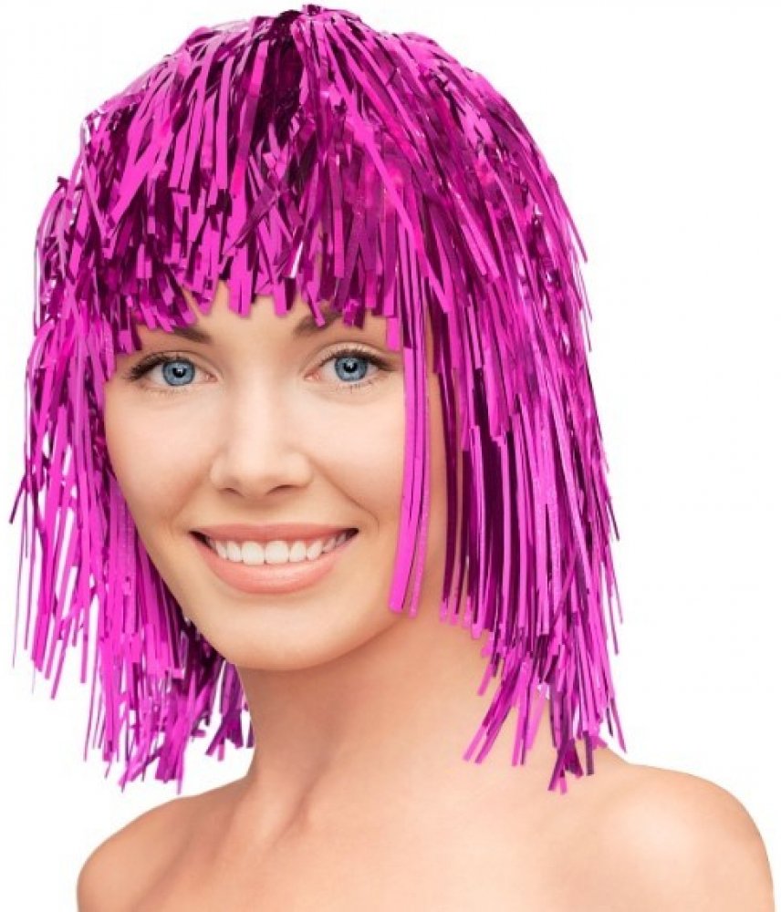 Paruka fóliová růžová. Vyrobeno z tenkých, lesklých proužků fólie, dokonale odráží světlo a upoutá tak pozornost. Paruka se síťovinou na elastickém pásku.
