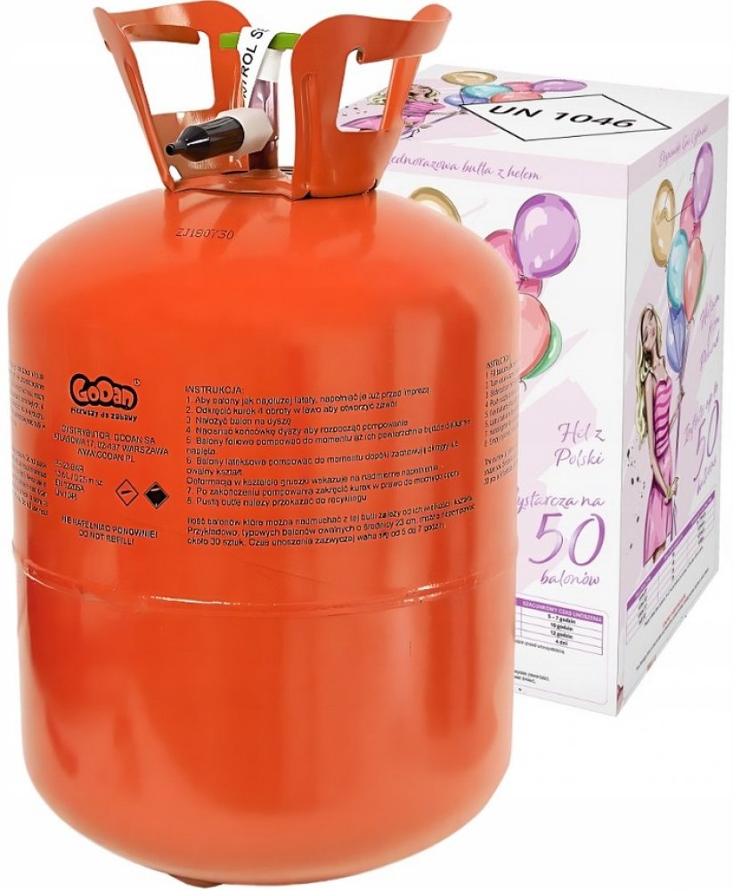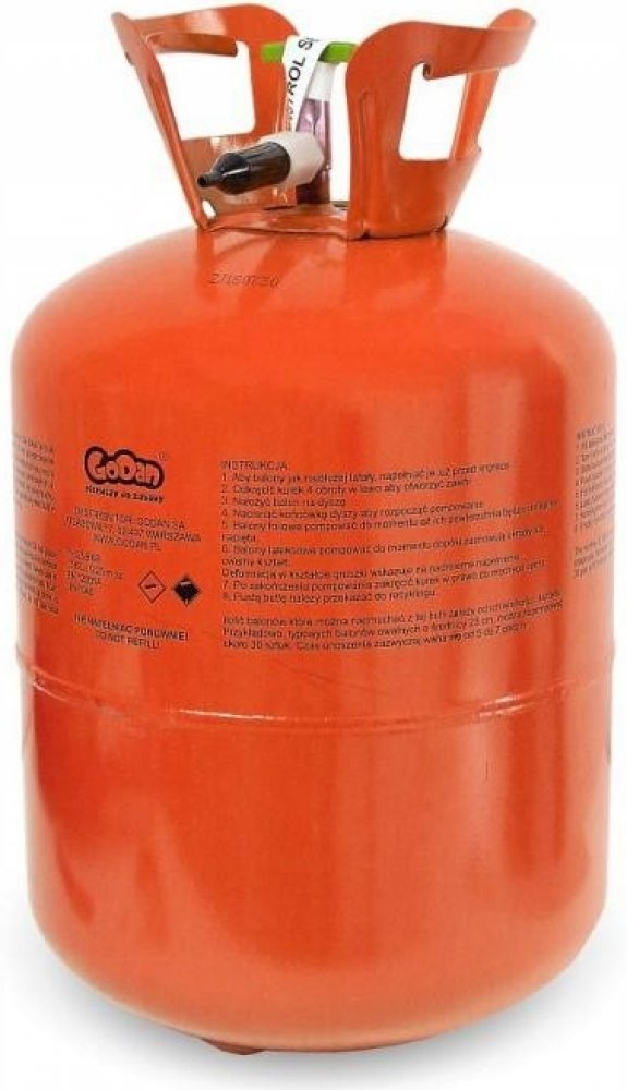S touto lahví lze nafouknout: - 48-50 ks (9”/22 cm) latexových balonkůnebo- 38-40 ks (10”/26 cm) latexových balonkůnebo- 28-30 ks (12”/30 cm) latexových balonkůnebo- 27 ks (18”/45 cm) foliových balonků - Lahev s heliem je na jedno použití, je nevratná a není na ni záloha. Po vypotřebování hélia, uděláte šroubovákem na vyznačeném místě díru a můžete láhev odevzdat do sběrného dvora, nebo vyhodit do kovového odpadu. Šikovní kutilové z lahve mohou vytvořit i gril, nebo květináče. - Héliová láhev je určena pro samo nafukování heliových balónků, latexových (gumových) i fóliových. Nádrž je vybavena ventilem, pro snadné nafouknutí balónků ihned po vyjmutí z kartonu. Nejsou vyžadovány žádné odborné zkušenosti ani další vybavení. - Bezpečnostní ventil je potřeba úplně otevřít, abyste zabránili zbytečnému úniku helia. Následně nasadíte balónek na černou hubičku (ventil) a ohnutím hubičky nahoru nebo dolů balónek nafukujete. Narovnáním do vodorovné polohy ukončíte nafukování. - Láhev je možné uzavřít a vyfoukat zbytek hélia později. Balení: 1x lahev o obsahu 0, 40 m3 helia. - 400 litrů