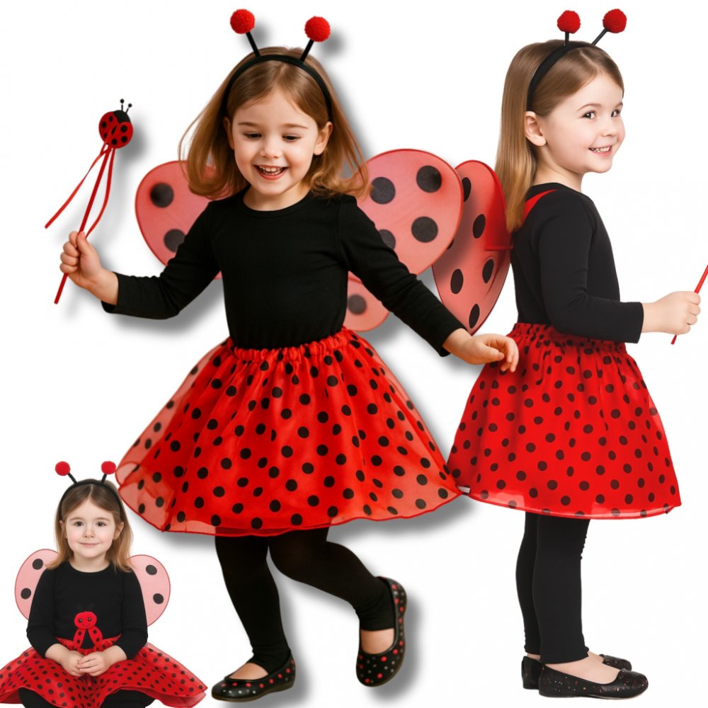 karnevalový kostým pro děti ve velikosti 90-120 cm značky Godan. Kostým brouček beruška obsahuje sukni, křídla, hůlku a čelenku. Sukně je na gumu, zakončena ozdobným