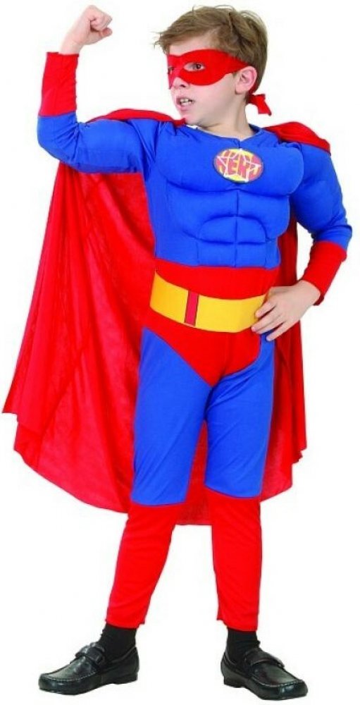Dětský karnevalový kostým Spiderman se svaly obsahuje kombinézu se svaly, opasek a pásem a kuklu na hlavu.