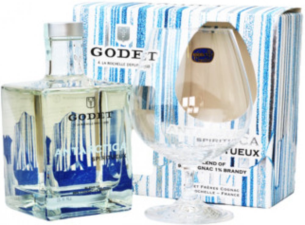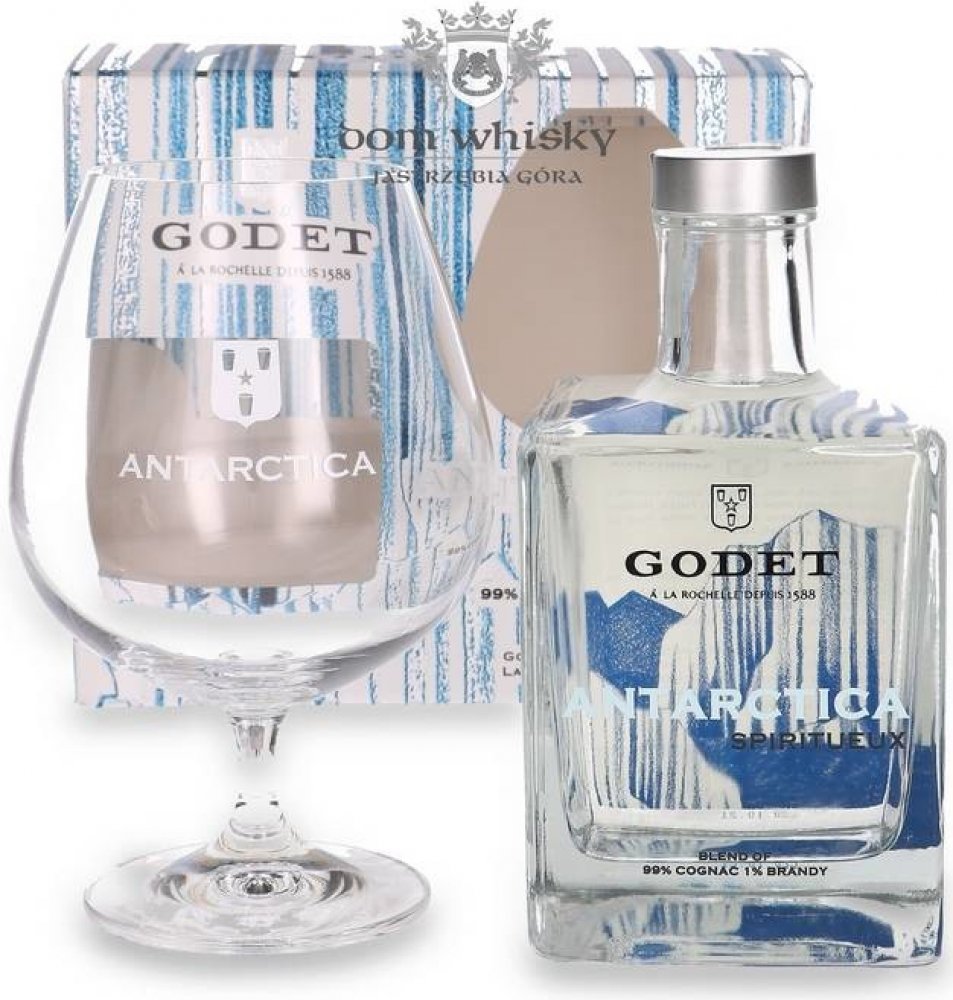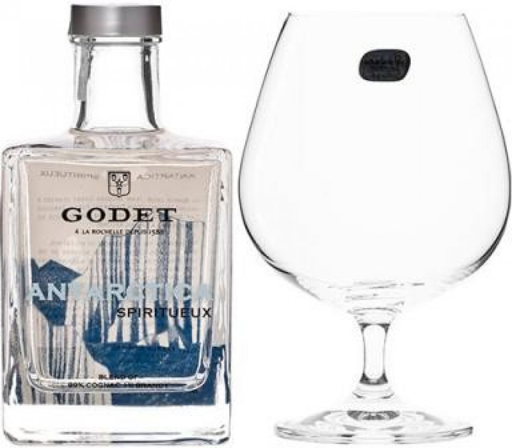 Dopřejte si nevšední bílý cognac Godet Antarctica v dárkovém balení spolu s degustační sklenkou na stopce!