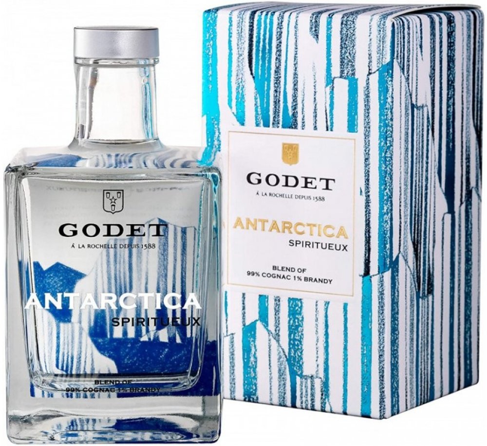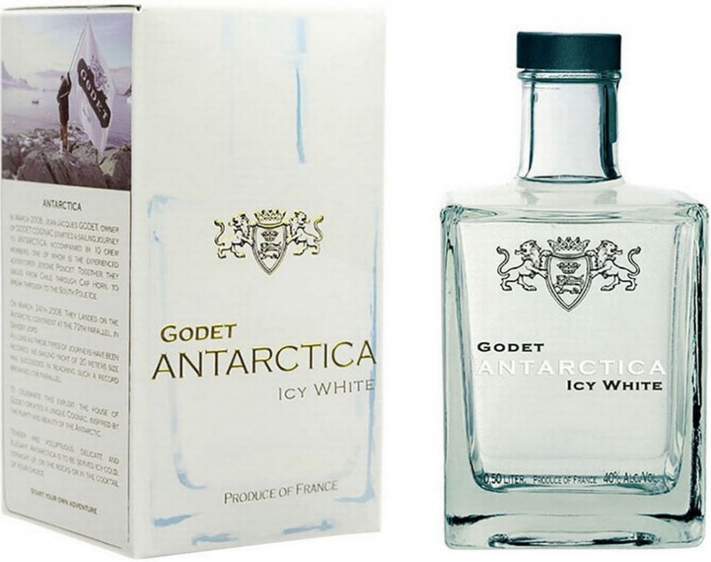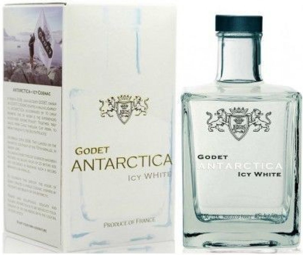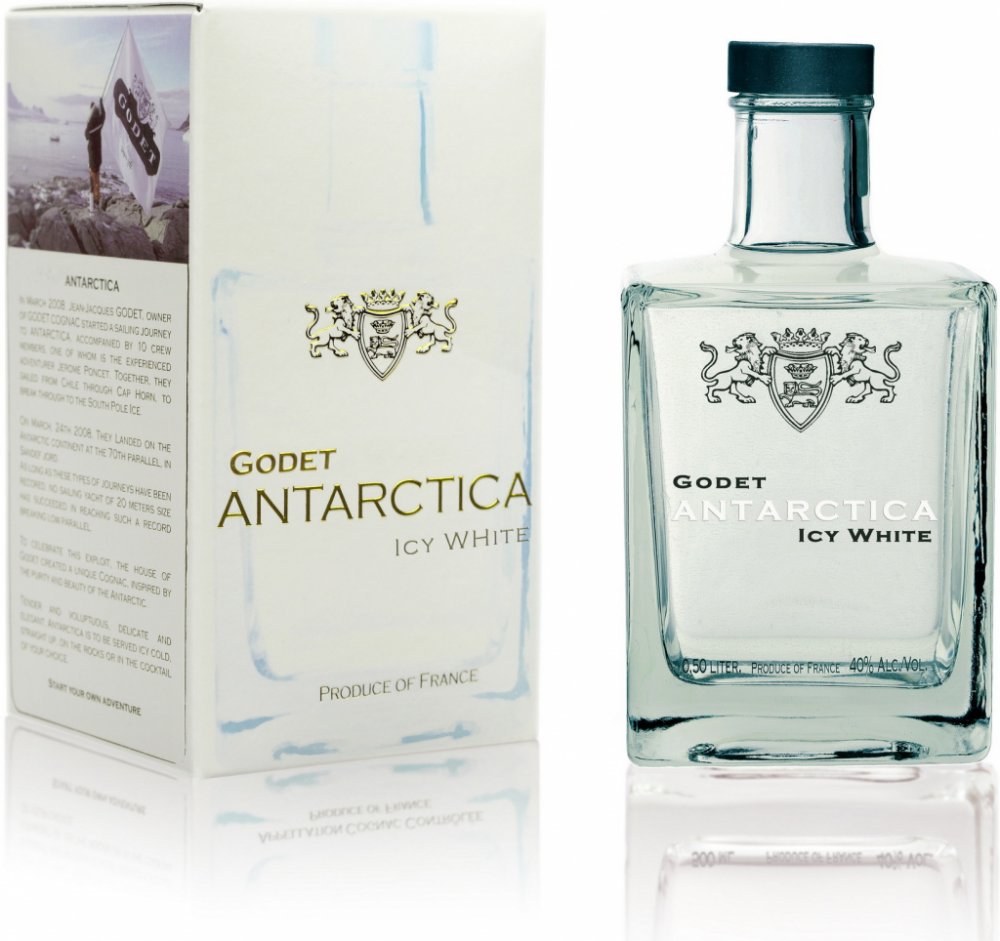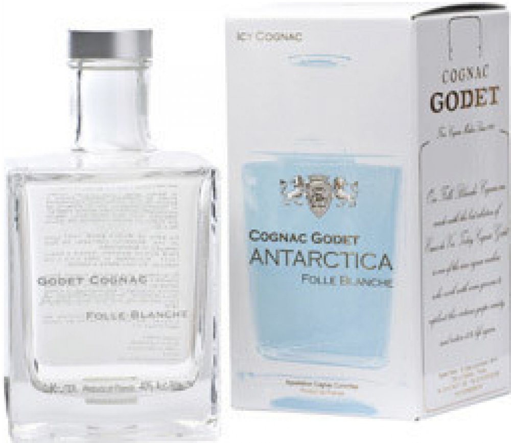 První bílý koňak na světě. V Březnu 2008 podnikl Jean-Jacques Godet cestu plachetnicí na Jižní Pól. Godet Antarctica vznikl jako pocta k této výjimečné údálosti. Jean-Jacques Godet se nechal inspirovat především čistotou a ryzostí tamní krajiny a vytvořil tento průzračný koňak. Pro destilaci byla použita výhradně odrůda hroznů Folle Blanche. Bílé barvy bylo docíleno díky přirozenému procesu filtra...