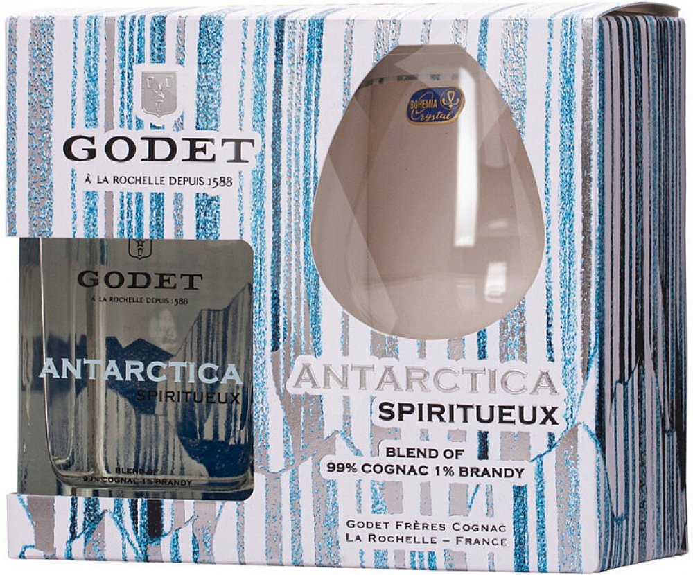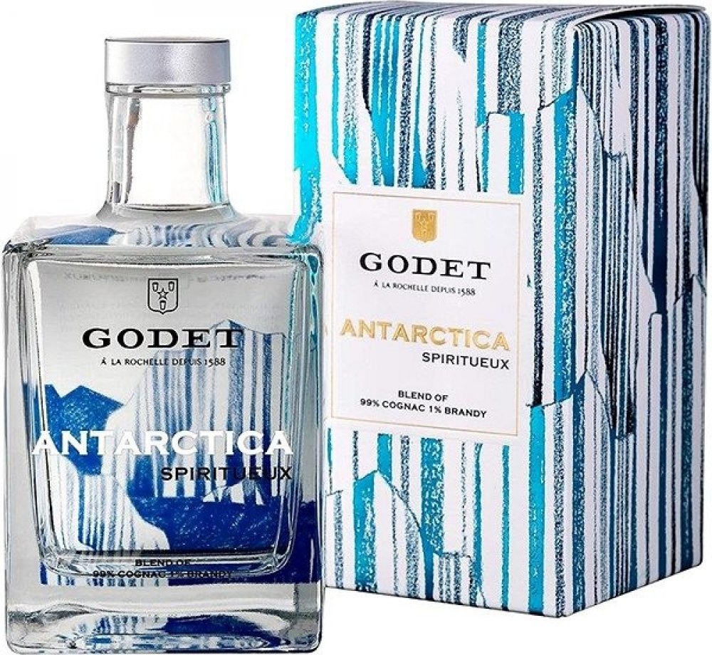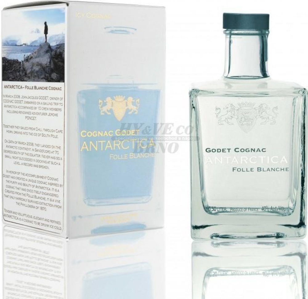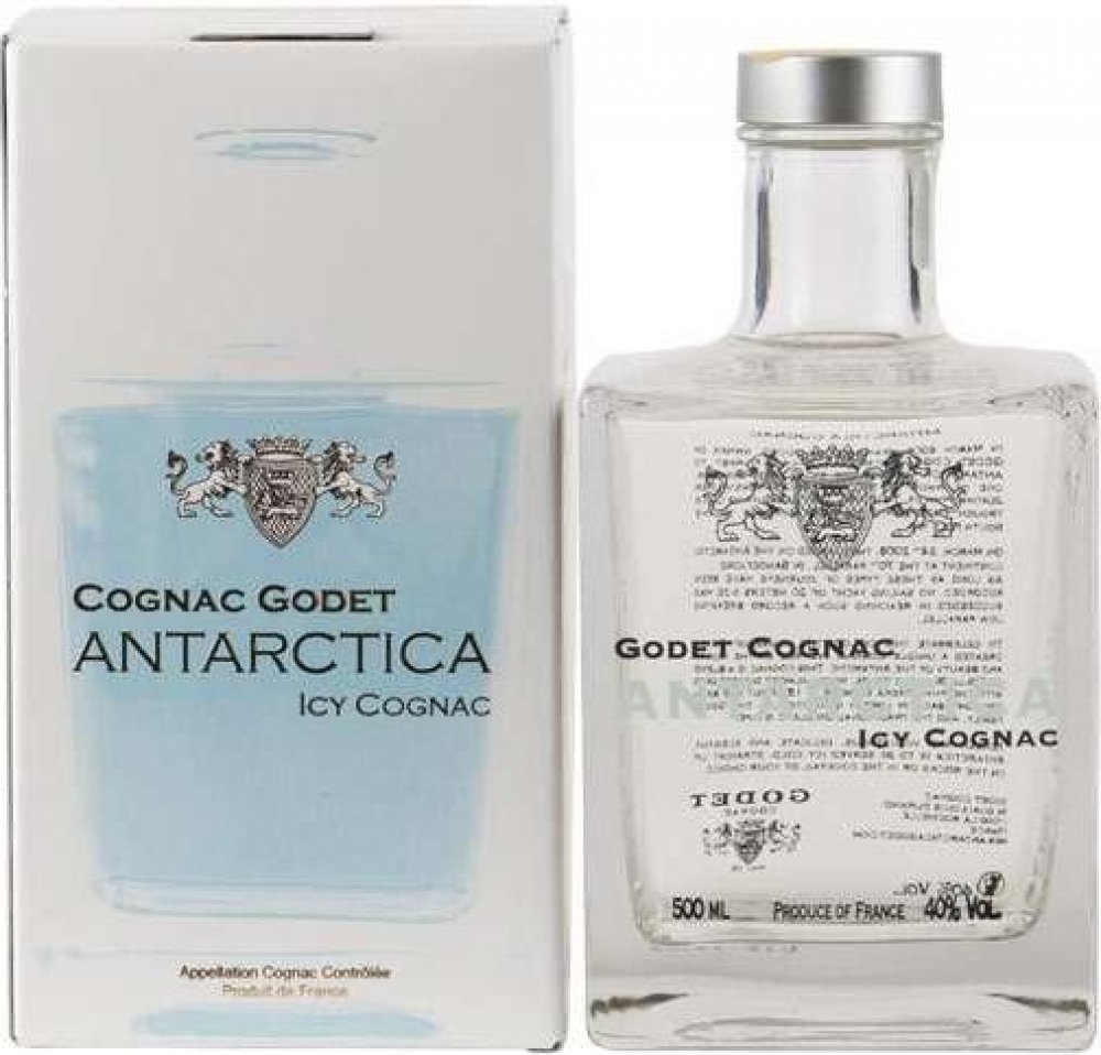 První bílý koňak na světě. V Březnu 2008 podnikl Jean-Jacques Godet cestu plachetnicí na Jižní Pól. Godet Antarctica vznikl jako pocta k této výjimečné údálosti. Jean-Jacques Godet se nechal inspirovat především čistotou a ryzostí tamní krajiny a vytvořil tento průzračný koňak. Pro destilaci byla použita výhradně odrůda hroznů Folle Blanche. Bílé barvy bylo docíleno díky přirozenému procesu filtra...
