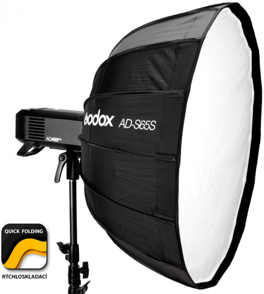 Godox AD-S65S Silver je parabolický softbox s deštníkovým otevíráním, stříbrnými vnitřními stěnami a průměrem 65cm určený pro použití s bleskem Godox AD400Pro Rozložení softboxu je stejně snadné jako otevření běžného deštníku proti dešti – nevyžaduje žádnou montáž a je rychlé a praktické. Softbox je lehký a ve složeném stavu snadno přenosný – můžete jej tedy bez větších potíží použít i mimo studio...