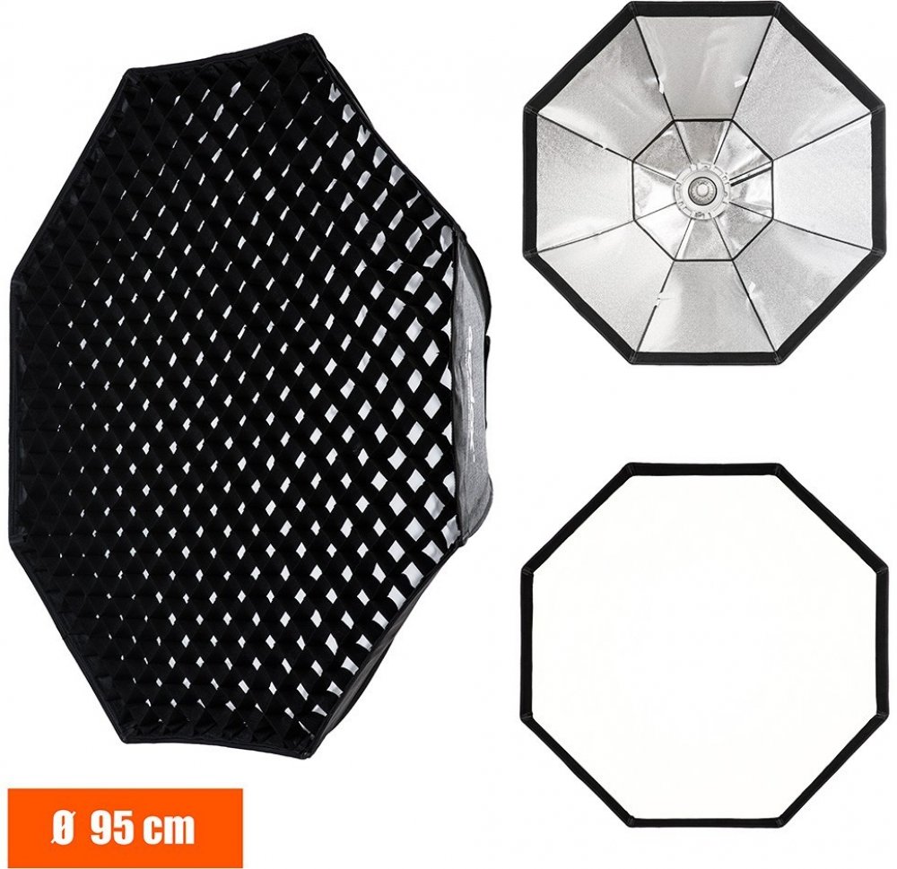 Softbox SB-FW z řady GODOX nejen šetří drahocenný čas, ale také usnadňuje práci s přístrojem. Konstrukce softboxu je založena na kovovém prstenci.K tomuto kovovému prstenci jsou připevněny pružinové tyče, které jsou zodpovědné za silné a rovnoměrné napnutí látky.V případě potřeby lze softbox během několika sekund složit a uložit.Povlak tvoří nylonová tkanina s rip-stop úpravou, softboxy jsou velmi odolné proti mechanickému poškození a zároveň velmi lehké. Vnitřek je opatřen stříbrným stíněním, které rovnoměrně rozděluje světlo po celém difuzoru. V přední části se nachází límec pro upevnění voštiny (je součástí dodávky). Ve spodní části softboxu je zip, který uzavírá otvor, jímž vyčnívá stativ.Sada obsahuje:Godox Softbox SB-FW95Vnější difuzorVnitřní difuzorKrytMřížka Godox SB-FW95 - Softbox 95 cm s mřížkou s 8 rohyVlastnosti:Softbox s mřížkouosmiúhelníkový tvarPrůměr: 95 cmPřipojení: S-Type Bowens, hliníkový kroužkový adaptérPříslušenství - Příslušenství pro tvarovače světla/zábleskové nástavceGodox Hlavní vlastnosti Vlastnosti Typ mřížky Kompatibilita se značkou Godox Barva výrobku Černá Hmotnost a rozměry Šířka 950 mm Hloubka 950 mm