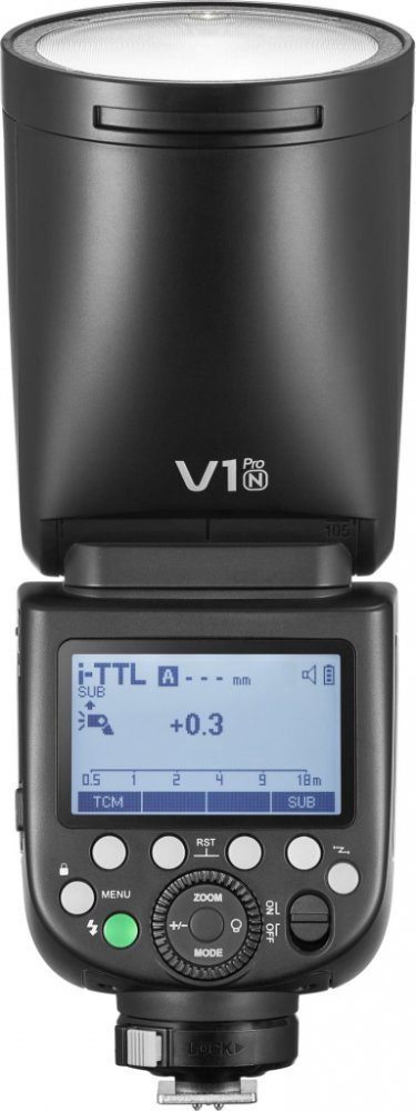 pro fotoaparáty Nikon, směrné číslo 28, informační displej a možnost natáčení hlavy blesku, napájení Li-ion (dobíjecí akumulátor) baterií, E-TTL, E-TTL II a HSS režim řízení expozice, profesionální, manuální, 500 záblesků na jedno nabití, doba dobíjení blesku 1,5 s, 120° náklon hlavy blesku, rádiové signály, maximální chromatičnost 5600 K, rozměry 15,2 × 10,2 × 5 cm (V׊×H), hmotnost 570 g, baterie a pouzdro součástí (V1PRON)
