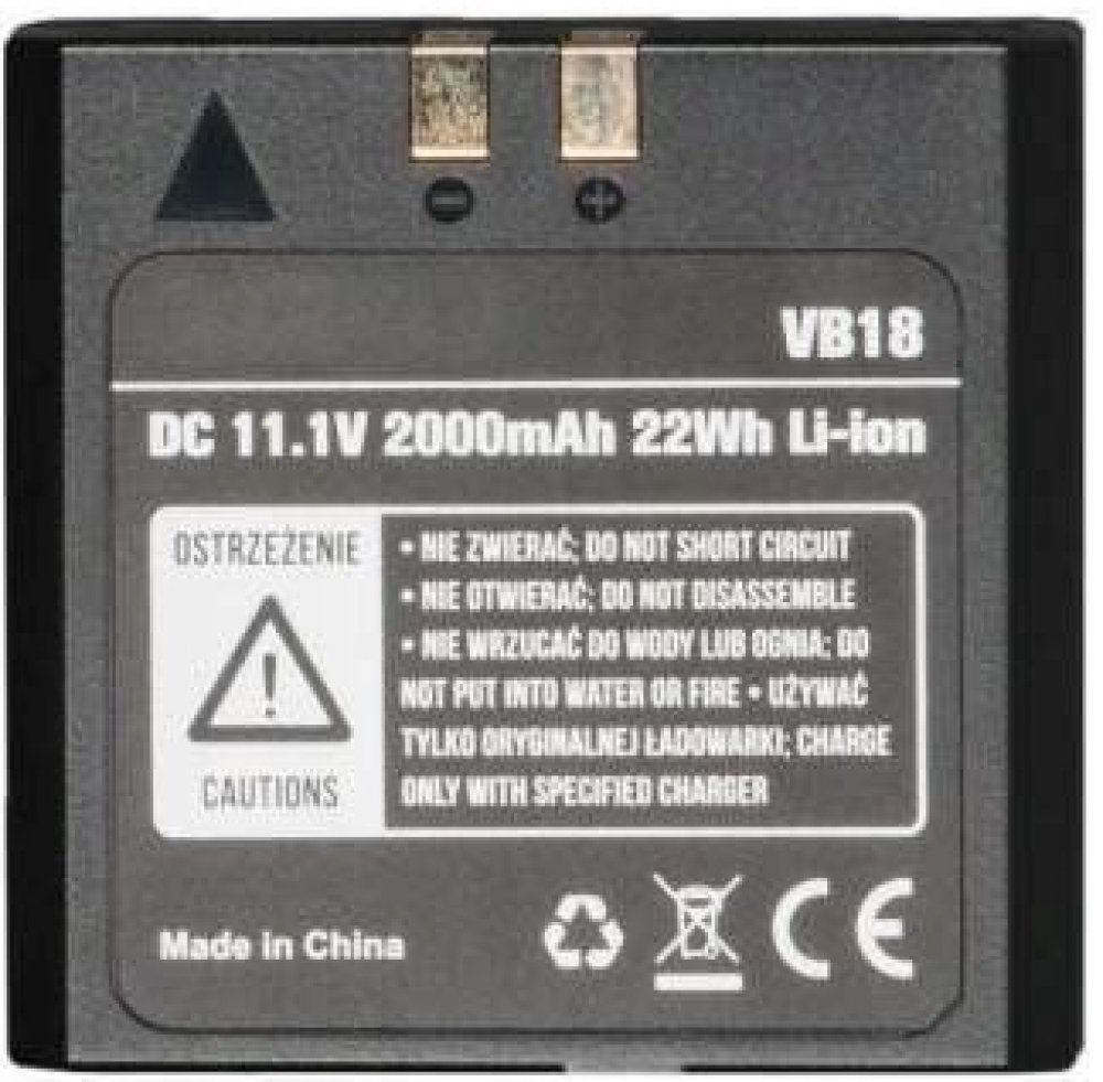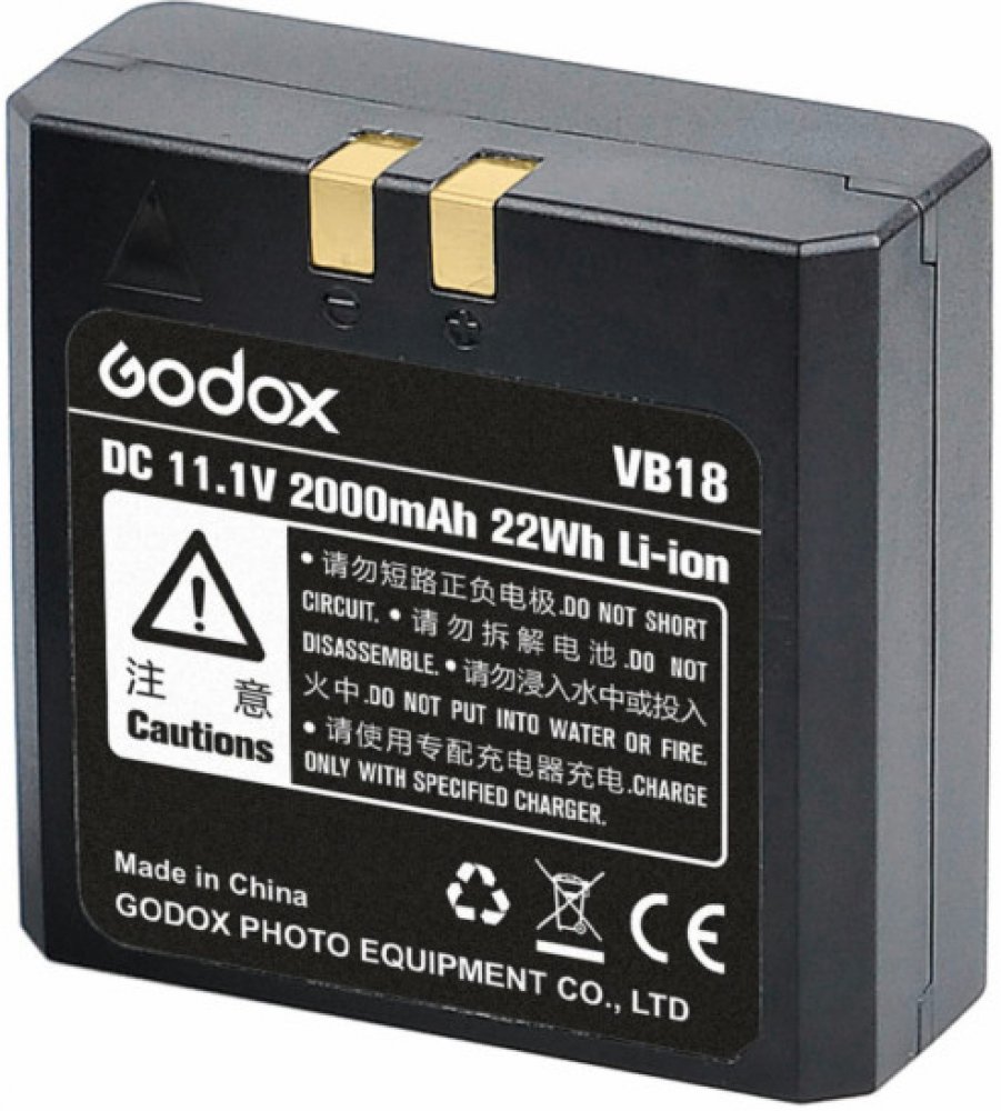 Náhradní Li-ion baterie Godox VB18 je určena pro externí blesky Godox V850II a V860II. Baterie poskytne dostatek výkonu až pro 650 záblesků na plný výkon blesku V860II a dobíjecí doba blesku na plný výkon je pouhých 1,5s. Kapacita baterie je 2000mAh (11.1V). Váha baterie je 136g. Baterie se nabíjí přibližně 2,5 až 3 hodiny (s nabíječkou dodávanou k blesku) nebo přibližně 4 hodiny s nabíječkou do auta. (V balení je pouze baterie, nabíječky se dokupují samostatně!)