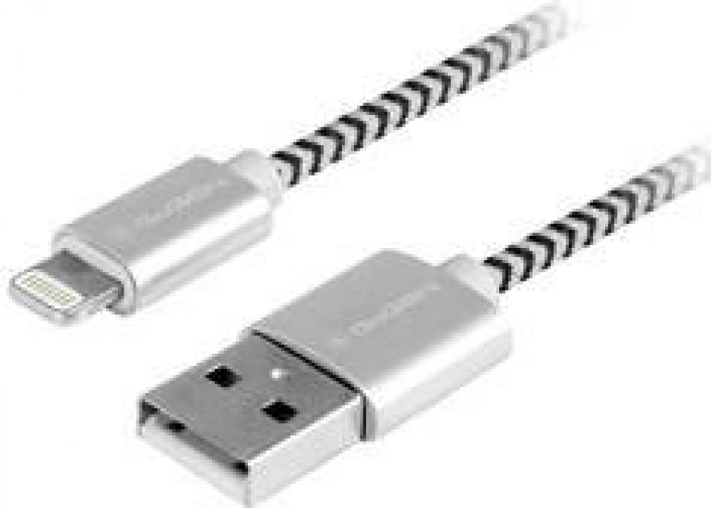 Datový a nabíjecí propojovací kabel Lightning 3 m, USB 2.0 A - Lightning vidlice, kovové konektory, textilní opletení, barva stříbrná.