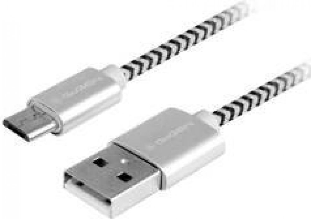 MicroUSB propojovací kabel, délka 1 m, vnější opletení, kovové konektory, stříbrná barva, vidlice USB A – microUSB