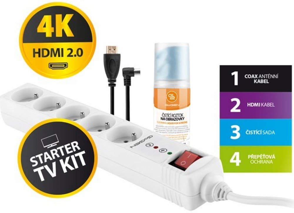 Sada příslušenství pro televizory a další elektroniku, přepěťová ochrana 5 x 16A, čistící sada 150 ml, HDMI 2.0 kabel 1,5 m, COAX kabel 2,5 m