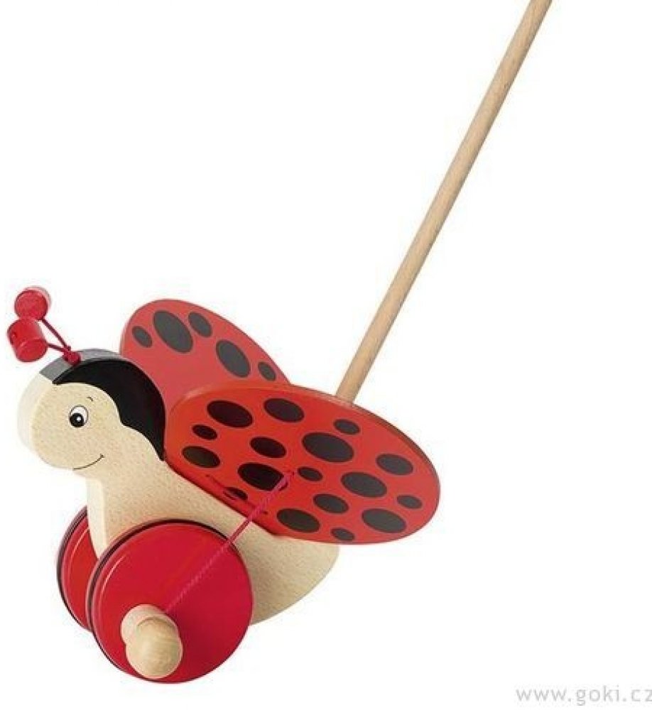 Pokud dítě tlačí tuto hračku, tak kačenka plácá nohama o podlahu. Dítě tlačí hračku před sebou na tyči. Vodící dřevěnou tyč lze z hračky jednoduše odšroubovat - dítě si tak může hrát čistě s hračkou bez tyče. Červená beruška při pomalé chůzi dítěte mává svými modrými křídly a to je právě to, co se dětem na této hračce tolik líbí. Beruška s puntíky pomáhá dětem zábavně zvládnout jejich první krůčky. Hračka je vyrobena ze dřeva, použité barvy jsou nezávadné. Vhodné pro děti od 18 měsíců.