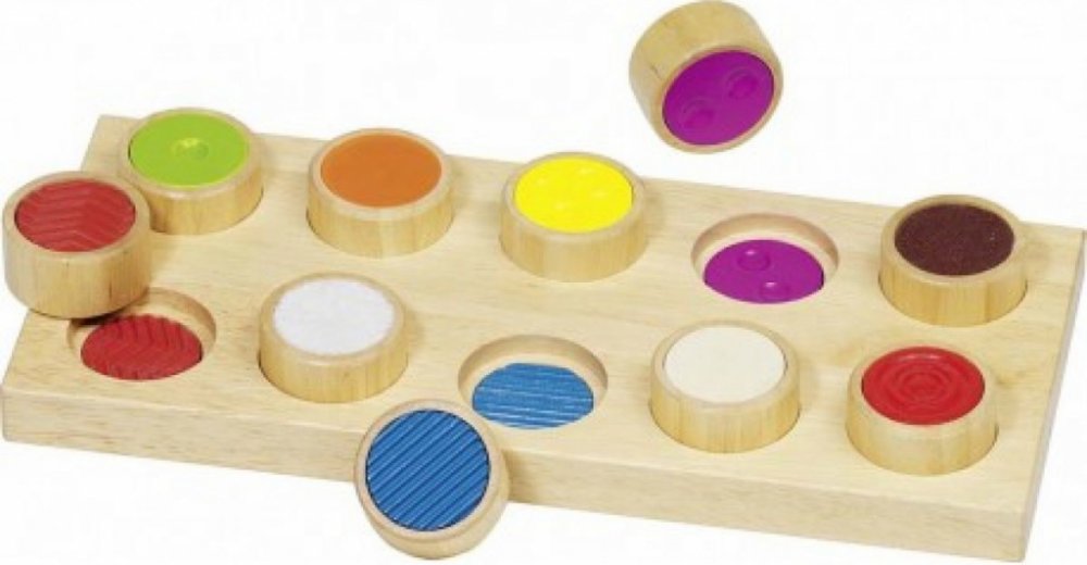 Hmatová hra určená k rozvoji hmatových smyslů, při které dítě rozpoznává různé povrchy hmatem a přiřazuje je ke správným otvorům v dřevěné podložce.