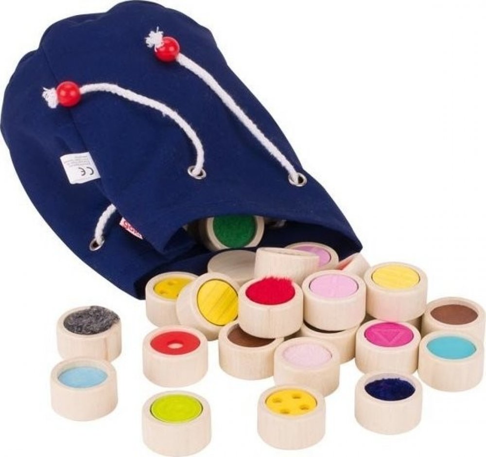 Sada obsahuje deset dřevěných válečků o průměru 4 cm, z nichž každý má jiný povrch. Stejné druhy povrchů jsou také v dřevěné podložce. Dítě se zavřenýma očima hmatem rozpoznává materiály a přiřazuje válečky do odpov...