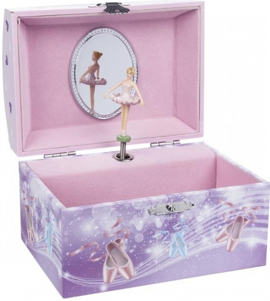 Hrací skříňka s prostorem na úschovu šperků a jiných holčičích pokladů. Baletka se točí za zvuku melodie z Labutího jezera. Vnější dekorace skříňky je spíše fialková, vnitřní barva růžová. Skříňka se natahuje klíčkem na zadní straně. Kování má stříbrnou barvu. Hrací skříňka je dekorace a není hračka.
